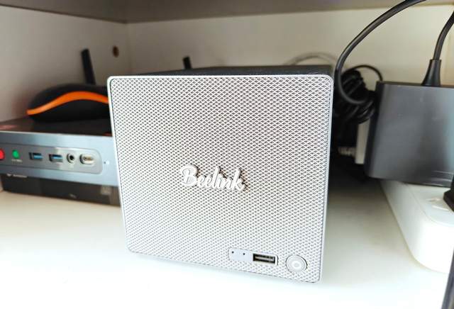 零刻ME Pro的身材依然小巧,是一个长方形的小盒子,金属的外壳带来了很好的散热效果,在正面顶部也刻有零刻和飞牛的logo。零刻ME Pro的正面非常简洁,一个开机按键,一个USB接口,两个复位按键,然后就没了。它甚至简单到后面设置完毕后不需要连接任何外设,只需要一键开机就能使用了。