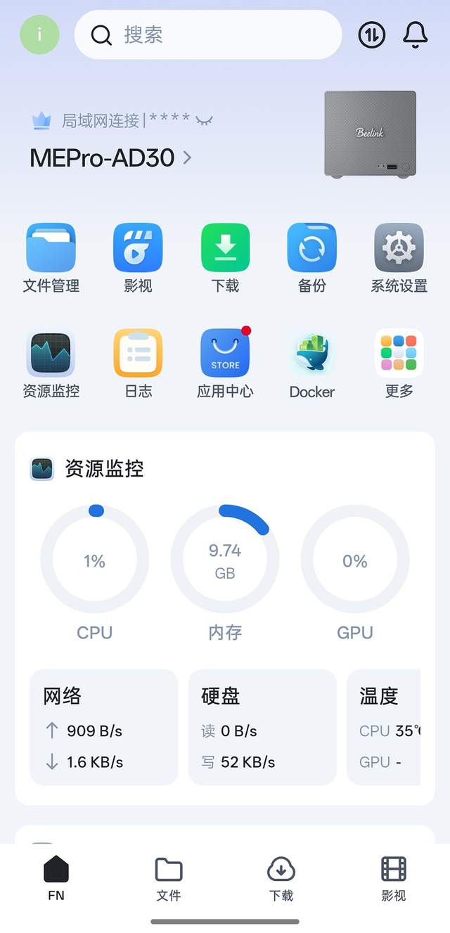 绑定完毕就能够在手机端直接访问零刻ME Pro上的飞牛系统了。接下来的界面和操作基本上就和我们常规使用的飞牛是一模一样了。它不但可以看到硬件的参数,也能实现文件的上传下载,还有非常好用的飞牛影视,可以搭建自己的影视系统。