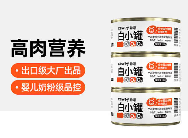 2025主食猫罐头排行榜前十名:希喂猫罐头的核心肉源是鸽肉、金枪鱼和鸡肉,都是原产地公开且符合HACCP标准的人食级肉源。原料中有肌肉组织、内脏、骨骼等动物成分,也有三文鱼油、啤酒酵母粉等提升适口性的食材,再搭配梨干、亚麻籽和丝兰,给猫咪提供全面且均衡的营养;肉含量高达96%,开罐就能闻到浓郁肉香,没有任何异味;0谷物、0淀粉,配方干净,玻璃胃猫咪也能吃。品牌的代工厂是山东汉欧大厂,从原料到成品要经过三重质检,即工厂自检+第三方检测+中央实验室检测,检测项目超千项,确保每一罐符合安全标准;还获得了多项行业认证,质检报告也是公开可查询的,透明度高且质量稳定,可以放心选购。