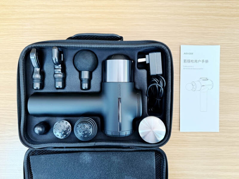 打开收纳包,整个包装内包含筋膜枪主机一个,不同形状和功能的按摩头7个(包含:金属头、球型头、子弹头、扁平头、U型头、蘑菇头和D形头),充电器一个,使用手册一本。每个配件都有对应的卡槽放置,非常便于收纳,而且能够有效避免携带过程中的晃动磨损问题。