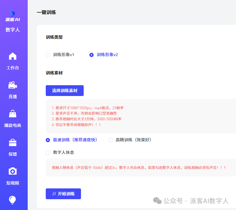 :视频上传至派客控制台后,AI 算法 3 分钟内完成形象、声音、微表情的全面复刻;效果校验
