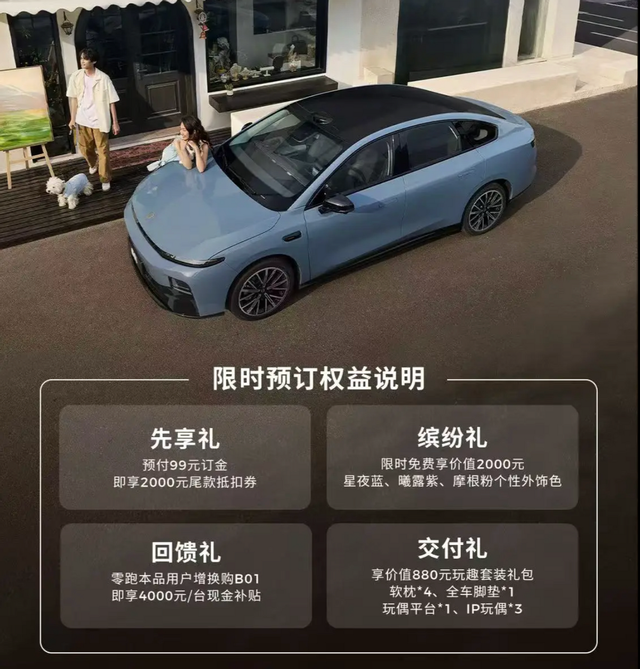 最后聊聊价格,零跑B01预售价10.58-13.58万,说实话这个配置在这个价位的车型里面已经非常有竞争力了,目前还有99元抵2000元、零跑本品用户增购享4000元现金补贴等预售权益政策,让大家感觉还是很有诚意的。