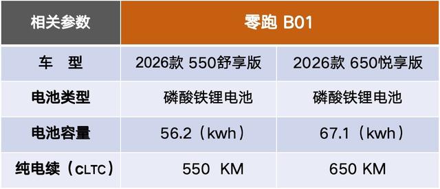 先说大家最关心的纯电续航,零跑B01提供了56.2kWh和67.1kWh两种容量磷酸铁锂电池的共计五款车型,CLTC标准下前者续航550km后者650km,续航里程超越了20多万的Model 3后驱版的634km续航了,但是价格却只要Model 3的一半,性价比可以说直接拉满。