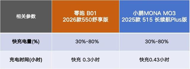 补能速度上,零跑B01从30%到80%需要18分钟,即使没电了着急出门也不怕,喝杯咖啡泡个面的的功夫,电就充的差不多了, 比加油几乎慢不了多少,让您没有补能焦虑。而小鹏MONA M03则需要43分钟,相对来讲速度要慢了不少。