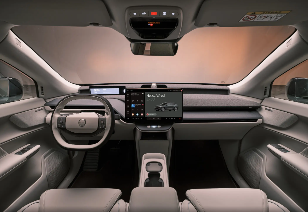 坐进车内之后,即便是燃油版本的沃尔沃,同样可以为大家呈现出极简的北欧风,所以在这台中型纯电SUV EX60身上,自然可以看到更符合纯电车的设计语言。沃尔沃EX60的中控台采用阶梯式的设计,营造简约氛围的同时还不失层次感,再加上车内大量的环保材料和皮革包覆,这些也能提升车内的档次感。除此之外,前排中央扶手区域的浮岛设计,也能提升车内的空间灵活性,再加上全车多达28个扬声器的Bowers & Wilkins音响系统,以及手机无线充电等功能,也进一步提升了用户的用车体验。