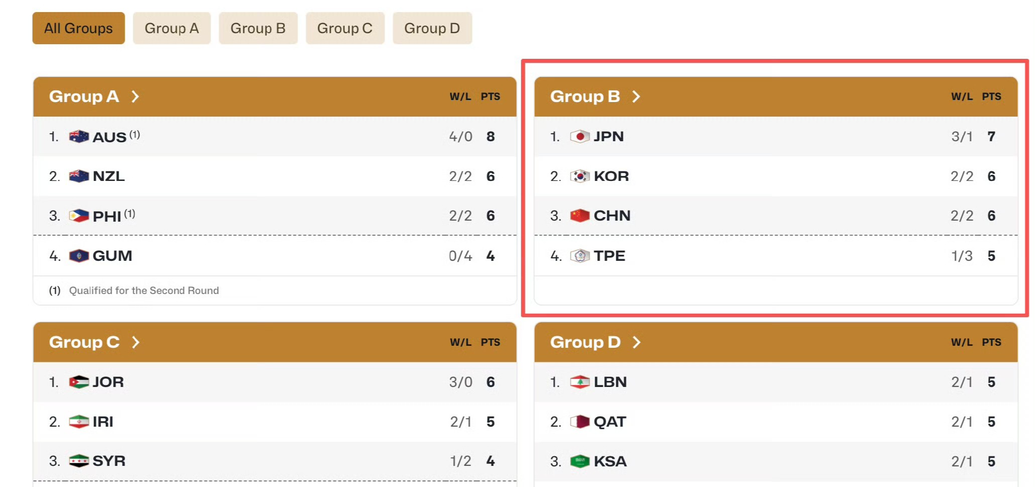 中国男篮分外亚洲区B组,小组第一为日本男篮,战绩三胜一负,只在主场输给过中国男篮。韩国男篮排名第二,第一个窗口期他们两次战胜了中国男篮,第二个窗口期先后输给了中国台北队和日本男篮。