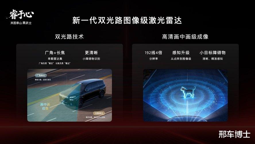 岚图泰山Ultra版和黑武士版搭载的行业最强的四激光雷达方案,其核心正是全球量产最高规格的896线双光路图像级激光雷达。这也是该项行业顶尖硬件率先实现量产装车,率先让用户体验到满血智驾。新车配备了四颗激光雷达,高清摄像头、毫米波雷达、超声波雷达等共计34颗智慧传感器组成的融合感知系统。