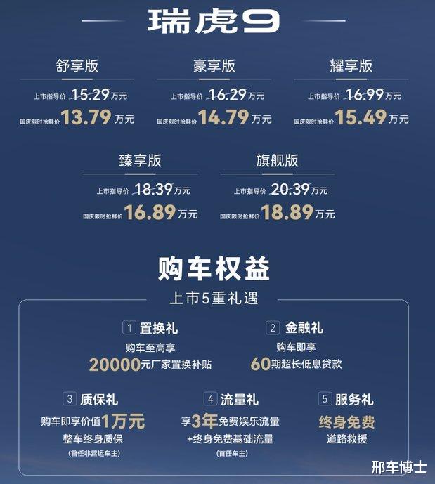 瑞虎9X还是超舒适旗舰,拥有12种可变组合空间,最大2065L后备箱空间与38处储物空间。配备一键舒躺女王副驾,气味3.0 + C - PURE净立方座舱等舒适性配置。超智慧旗舰方面,有同级唯一高通8255车规级芯片,还有强大的伯牙之音环绕音箱系统。安全上按照全球五星安全标准设计,高强度钢车身搭配前双防撞梁等安全配置。超性能旗舰的属性使其在动力和四驱系统上表现卓越。