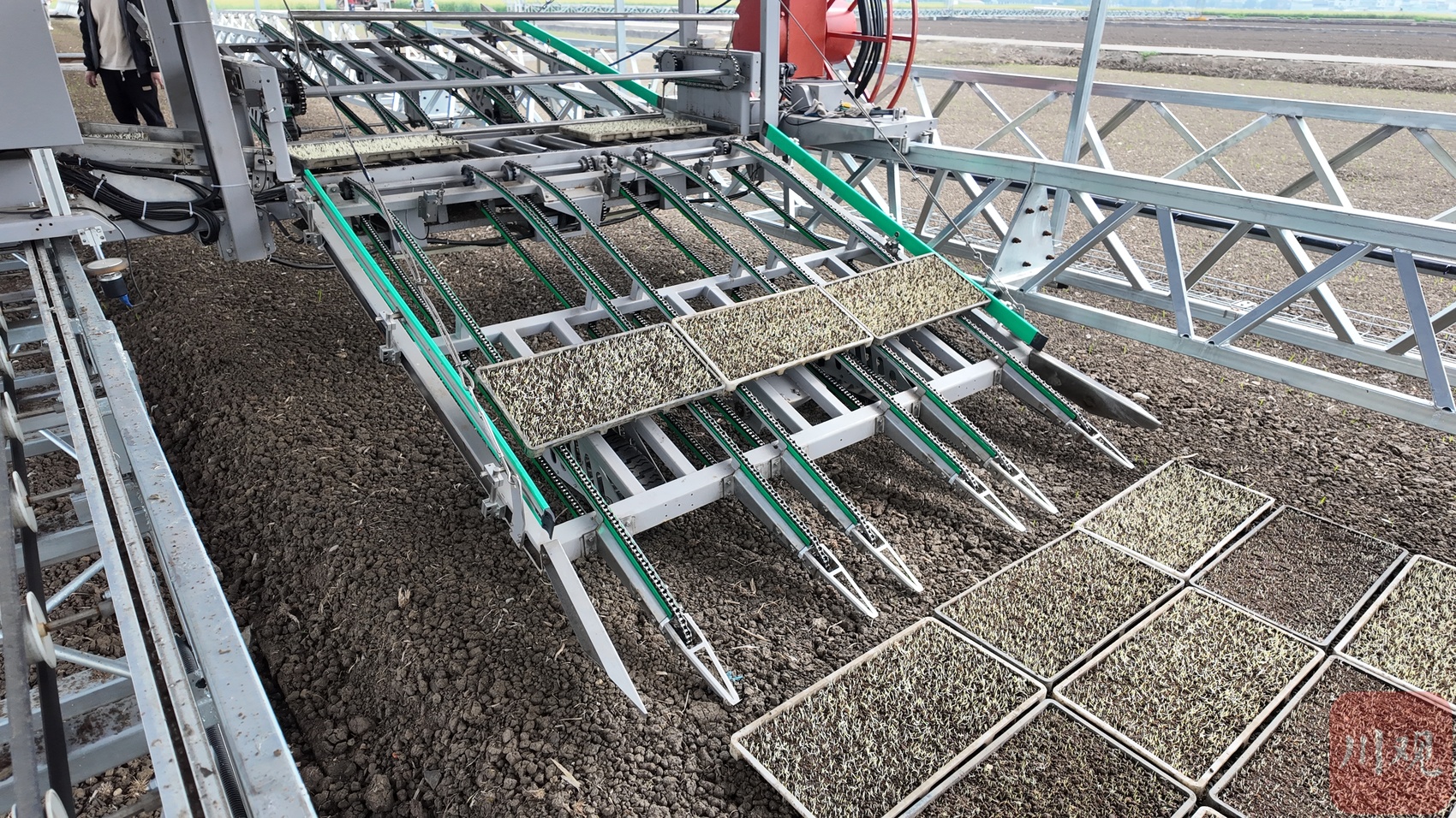 4月16日上午,广汉市连山镇锦花村,种粮大户冷辑龙轻轻按下一台“特殊”育秧设备的按钮,传输带随即运转,一盘盘秧苗缓缓移向田间。约1分钟后,40多盘秧盘已被整齐地“种”入田中。“这台新设备效率非常高。”冷辑龙介绍,过去需要20多名工人才能完成的育秧工作,如今3人即可完成。“可以节约人工90%以上,每年省下5万元—6万元。”他说。记者了解到,这台设备每小时可摆秧盘约2500盘,起秧盘约1500盘。