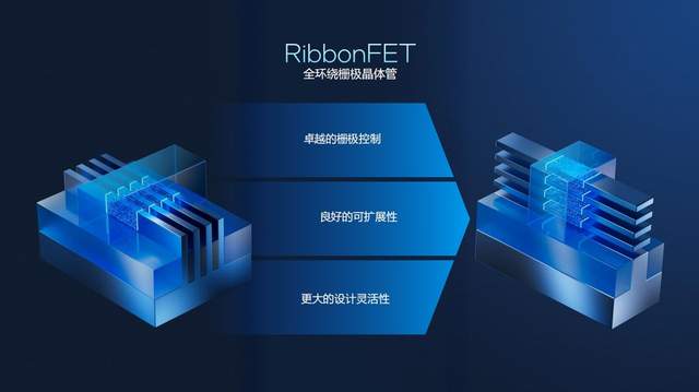 RibbonFET(栅极环绕技术)其命名中的 “Ribbon”(彩带)形象诠释了电流通道的全新形态:如同悬浮的纳米级薄片,栅极可从四面完整环抱电流通道。这一设计不仅大幅增强晶体管的开关控制精度与响应速度,更能显著抑制漏电现象,实现 “控电精准、损耗极低” 的效果。另外,RibbonFET的优势体现在两个方面:其一,能效表现更优——在同等频率下可降低工作电压,或在同等电压下提升驱动能力,每瓦性能的提升精准契合行业对能效的核心需求;其二,设计灵活度更高——通过调节纳米片宽度、层数,搭配不同电压阈值,可在同一工艺平台衍生出高性能、低功耗等多类晶体管规格,为客户提供 “按需定制” 的设计自由度,完美适配多元终端场景。