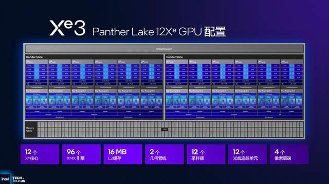 作为Xe3 GPU家族的旗舰级规格,12 Xe GPU则是适配高性能场景的核心利器。该规格硬件参数极具竞争力,涵盖12个Xe核心、96个XMX引擎、16MB L2缓存,同时配备2个几何管线、12个采样器、12个光线追踪单元及4个像素后端。不仅能为复杂计算任务提供澎湃动力,还可以大幅提升画面渲染与处理效率。同时,16MB L2缓存可有效降低数据访问延迟,保障算力持续释放。综合来看,12 Xe GPU在计算、渲染以及缓存性能方面颇为强大。