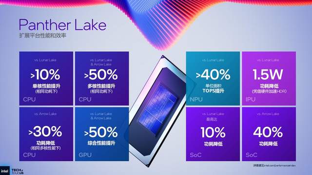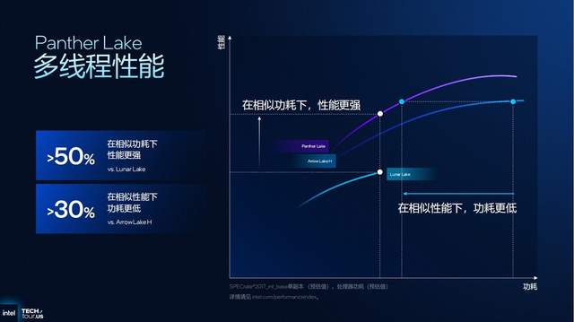 根据英特尔官方数据,Panther Lake的多线程性能在相似功耗下,面对Lunar Lake有50%的性能提升;而在相似性能下,较Arrow Lake H平台有30%的功耗下探。