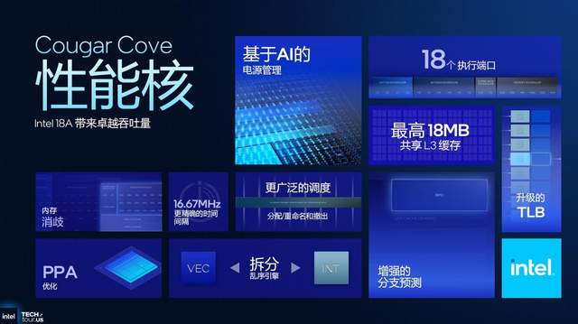 值得一提的是,Panther Lake的性能核采用全新的Cougar Cove架构,旨在提升单线程性能和吞吐量。全新的性能核采用增强的分支预测以及拆分乱序引擎,并拥有多达18个执行端口。Cougar Cove源自Arrow Lake的Lion Cove,并在此前积累的丰富性能优化基础上,进行了更深层次的精进。而其主要有三点核心优化:第一是内存消歧,Cougar Cove能大幅提升CPU与内存带宽利用率。相较Lion Cove,其消歧技术更可靠、细节更精准、恢复速度更快,可更好打通内存数据传输“堵点”。第二是TLB增强,TLB作为CPU内虚拟与物理地址的映射缓存,对混合型负载至关重要。Cougar Cove通过优化TLB,避免CPU频繁访问系统内存进行耗时页表遍历,以预存常用地址映射实现快速查找,显著加速内存访问,提升复杂场景性能。第三是分支预测。Panther Lake在Lunar Lake中引入分支预测新的算法基础上,进行了深度迭代与优化,可以让分支预测的效率更高。