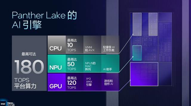 由于CPU能提供10TOPS的算力,GPU能提供120TOPS的算力,NPU能提供50TOPS的算力,这就让Panther Lake拥有180TOPS的平台总算力,因而其能够更好地应对不同场景的应用需要。