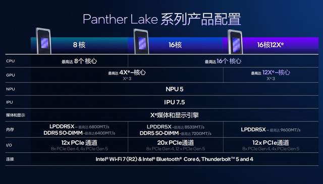 Panther Lake的产品有8核、16核,有不同的GPU的配置,这一切都得益于SoC、Xe架构的优化,也包括我们在Foveros封装技术方面的升级,为产品带来了更多灵活性。Panther Lake这款产品最多可以有16核的CPU,最高有12个Xe核的GPU——其中,8核心产品:CPU最高8核心设计(4P+4LPE),GPU配备4个Xe 3核心,最高支持LPDDR5X 6800或者DDR5 6400内存,配备12条PCIe通道。16核心产品:CPU最高16核心设计(4P+8E+4LPE),GPU规格与8核心产品一致(4个Xe 3核心),最高支持LPDDR5X 8533或者DDR5 7200内存,配备20条PCIe通道。16核心加强版产品:CPU最高16核心,GPU规格大幅提升至12核Xe 3,同时最高仅支持LPDDR5X 9600内存,内置12条PCIe通道。