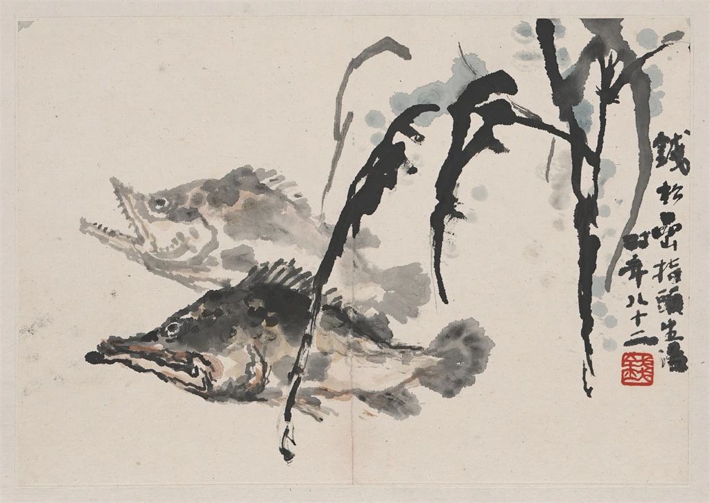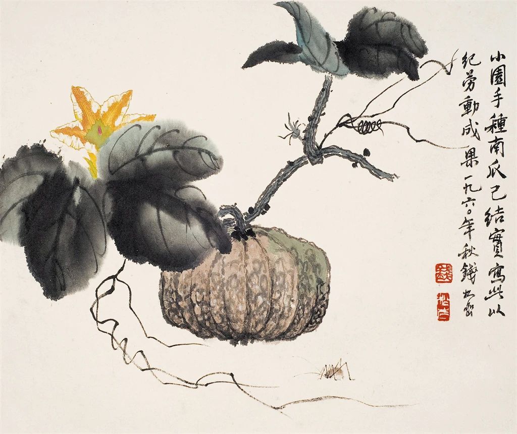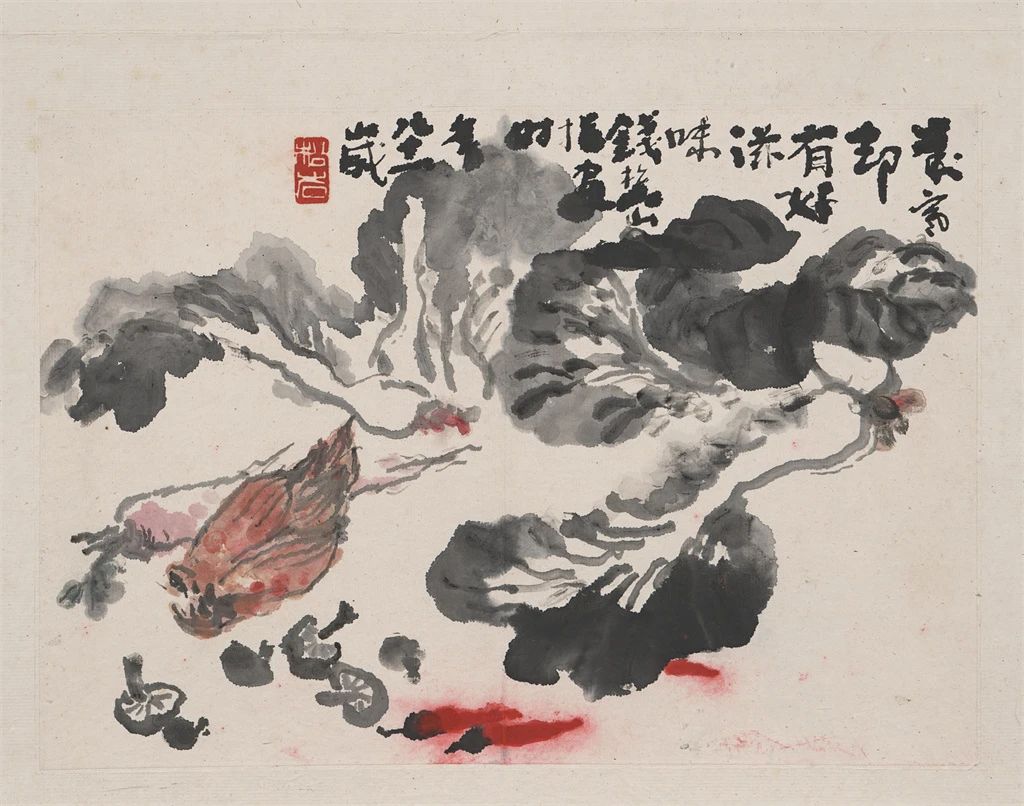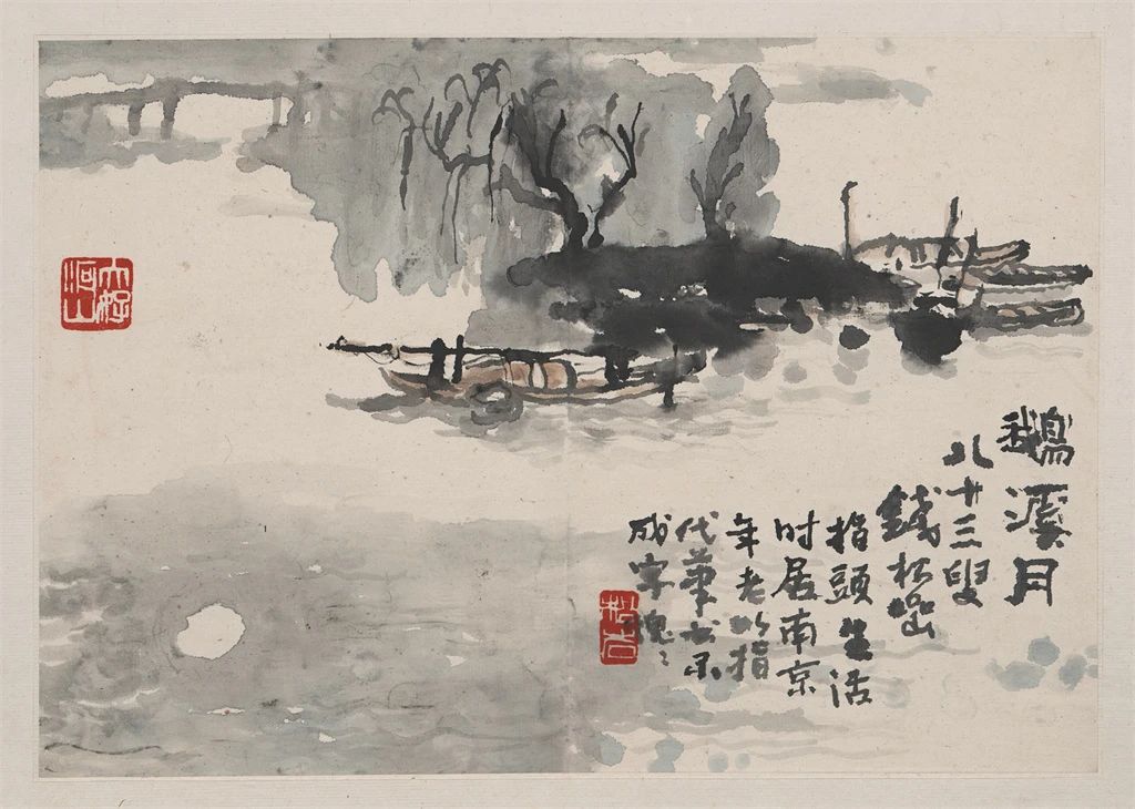 钱松喦先生的画风独树一帜,笔墨运用精湛而富有创新精神。他巧妙地将“以书入画”的技巧融入创作,将篆隶与魏碑的笔法特质融入画中,赋予了作品一种古朴、雄健和深沉的艺术美感。他注重骨法用笔,以金错刀的“颤笔”技巧勾勒线条,使得画面洋溢着强烈的力度感和生动的节奏感。在墨法上,钱松喦先生精于破墨、焦墨、积墨等多样技法的巧妙运用,使得画作层次分明、墨色浓淡得宜,展现出苍茫润泽、墨色斑斓的视觉效果。