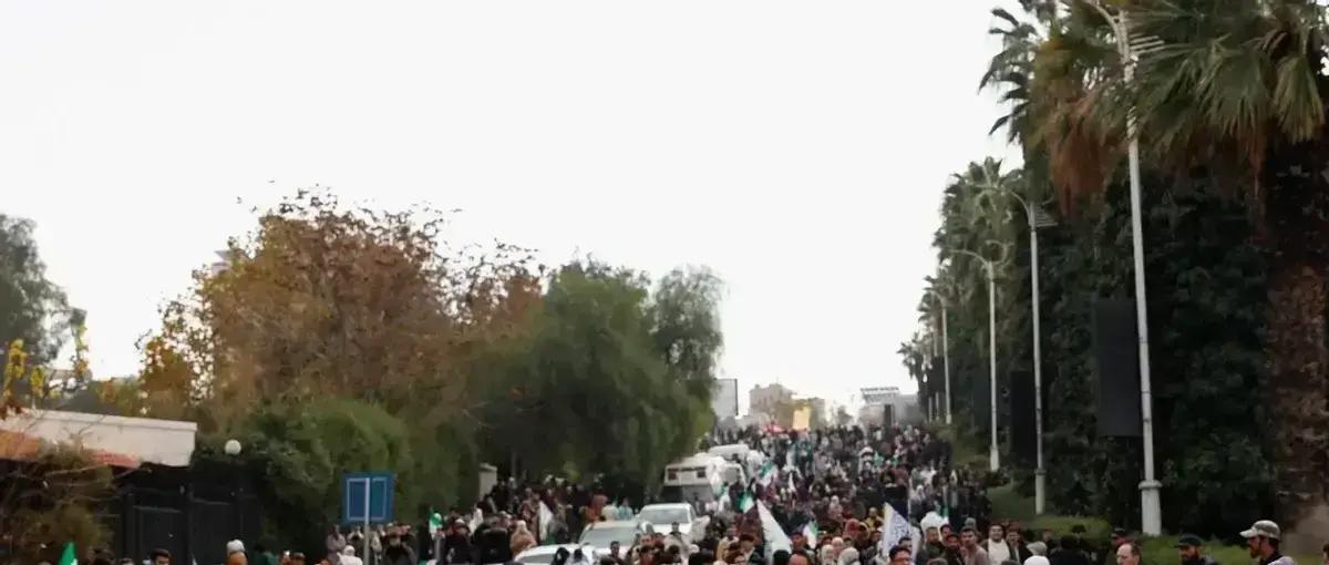 倭马亚广场上,满是带有新图案的旗帜。旧日高悬的画像已经消失,取而代之的是“艾哈迈德·沙拉”的名字,以前那几句老掉牙的口号也听不到了。一个曾经只能私下提起的名字,这天终于在台上公开发声:“这一页翻过去了。”