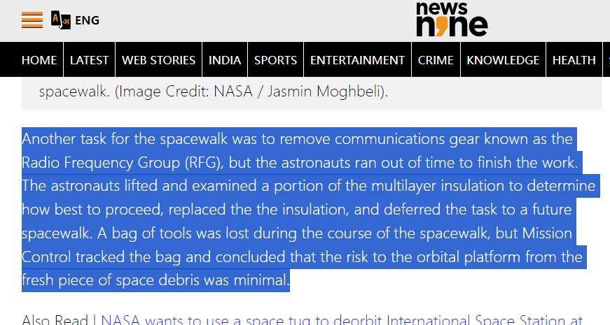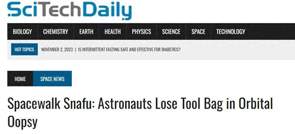 没错,这一次任务结束之后,多家外媒指出,国际空间站这一次太空行走,并且对国际空间站维修出现了意外的情况,那就是丢失了——工具袋。