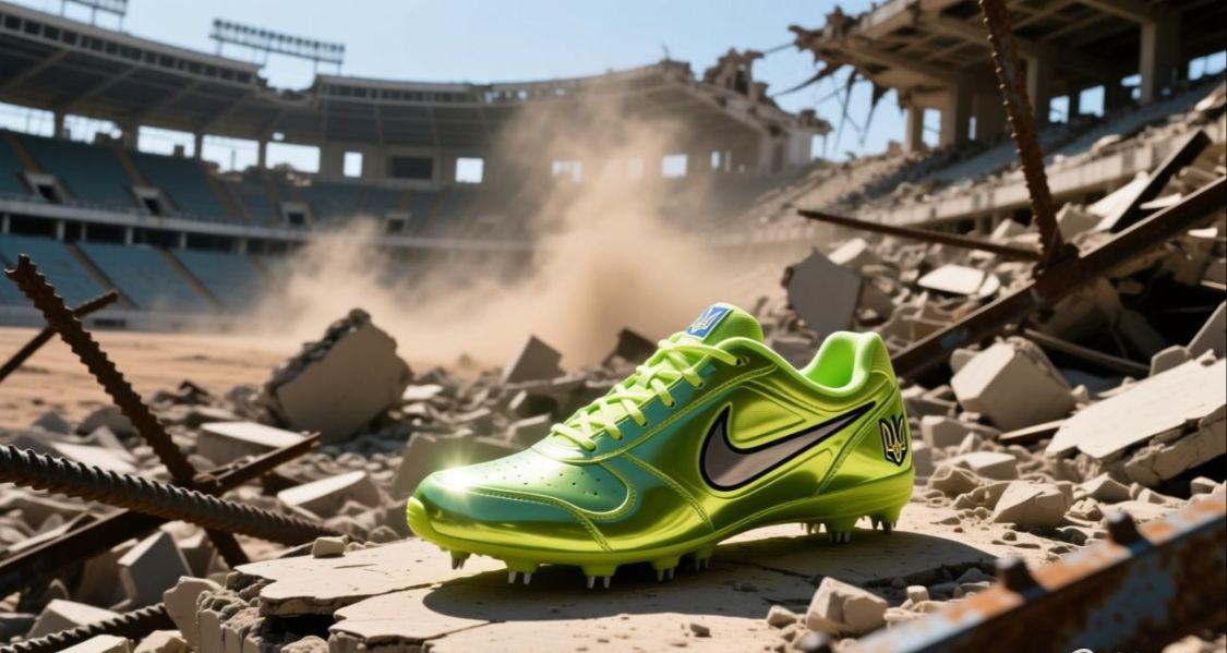 在乌克兰东部,有一个体育场成了废墟,那是被轰炸后的样子,在这片废墟当中,救援人员发现了一只钉鞋,它是崭新的。