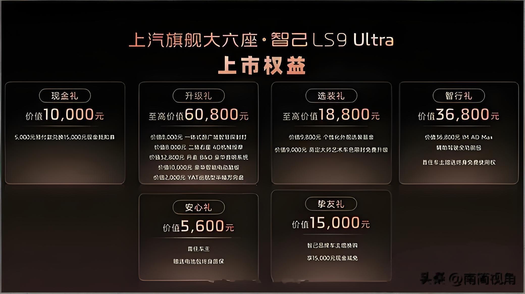 11月12日晚,一款新车的上市发布会现场,正悄然上演一场关于中国汽车工业未来的隐喻。上汽集团旗舰六座SUV智己LS9以32.28万元起的价格正式亮相。只要在2025年11月25日(含)前完成锁单,即可尊享智己LS9的全系上市权益。具体包括:现金礼,5000元预付款可直接抵扣15000元购车款;升级礼,限时免费升级价值不菲的丹麦B&O豪华音响系统;选装礼,限时免费升级4D机械按摩座椅;此外还有包含智能驾驶服务的智行礼、确保年内提车权益的安心礼以及针对老车主或推荐购车的挚友礼等多重专属福利。