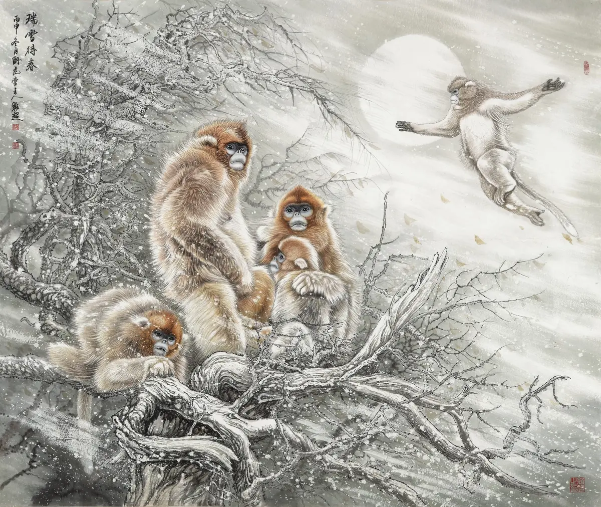 画面以 “瑞雪” 为背景,却不彰萧索:猴群聚处是 “生机焦点”,暖棕毛色在冷白雪景中格外醒目,传递 “生命不畏严寒” 的意趣;右上角跃动的灵猴与圆月、飞雪构成 “动势之美”,似在迎接春讯,与题款 “瑞雪待春” 呼应。整体意境清冷却不孤寂,静谧中蕴含 “冬将尽,春可期” 的希望感,赋予自然图景人文哲思。