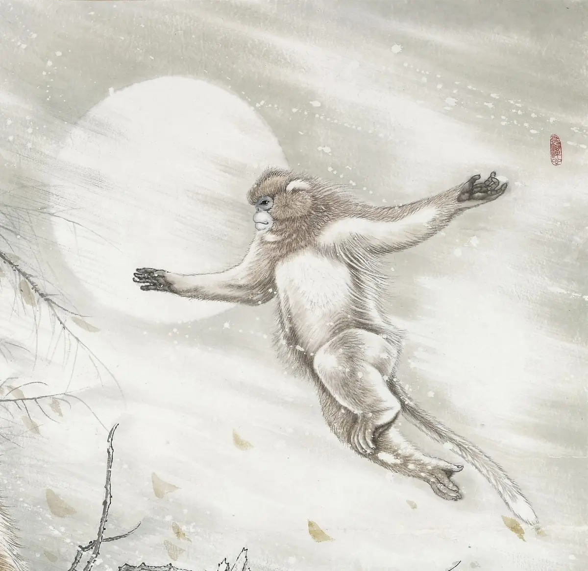 采用聚散式构图:猴群集中于中下部,形成 “实” 的视觉重心;右上角跃猴与朦胧月色、飞雪构成 “虚” 的延伸空间,虚实相生间,既收拢视线,又拓展出 “寒林广漠,春意渐生” 的意境广度。笔墨上,工笔的精细(猴毛、枝干肌理)与写意的朦胧(飞雪、月色晕染)相融,让画面 “精微写实” 之余,兼具 “诗意空灵” 的气韵。