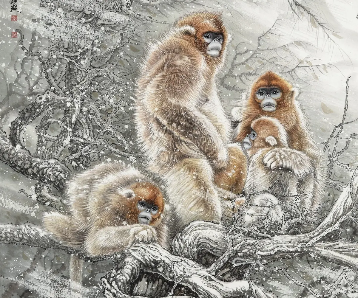 金丝猴关联 “灵动”“祥瑞”,“瑞雪” 象征 “丰年希望”。作品通过 “灵猴待春于瑞雪”,既描绘自然生命的鲜活,又暗含对 “时序更迭、希望永续” 的美好寄寓,让工笔动物画超越 “写生”,成为人文情感的载体。