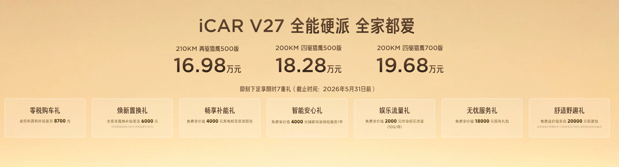如果用一句话概括,我觉得iCAR V27是越野梦和精致控焊在了一起!作为一个“颜控+实用主义者”,看到V27的第一眼就很喜欢!它叫“家庭新硬派”,这名字起得真不虚!方方正正的“盒子”造型,配上直立的A柱和超低窗线,不仅硬派感拉满,视野还特别通透,完全没有普通方盒子车那种压抑感~车内挑高达到了惊人的1350mm,后排座椅放倒秒变2米大床,这简直就是为带娃露营量身定制的移动城堡啊!而且全车有50处储物空间,以后再也不用担心宝宝的奶瓶、玩具没地方放了。动力方面,它搭载了奇瑞1.5T黄金增程系统,综合续航能跑1200km+,长途自驾完全没焦虑。更厉害的是它配备了MRC磁霸悬架,还有地平线征程6P芯片加持的高阶智驾,这配置在同级里绝对是“卷王”级别的。这车简直是满足了我的“既要又要”,心动不如行动,抽空我得去试试~