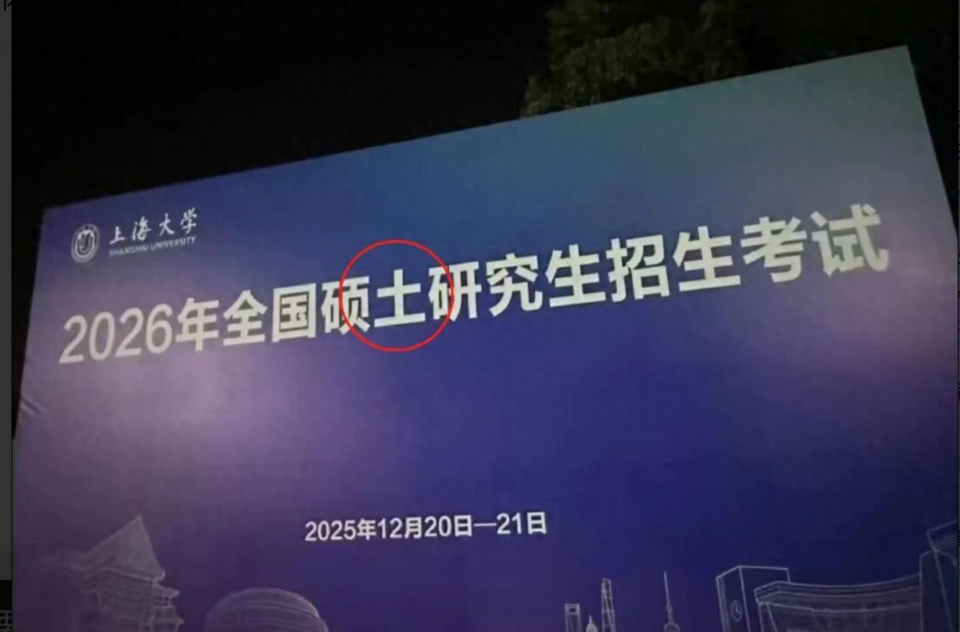 就在2026全国研究生考试笔试前几天,有网友发现上海大学一块招生展板上的“硕士”写成了“硕土”。12月19日,潇湘晨报报道后,瞬间在网络上炸开了锅,校方回应是输入法识别问题,已经更改。