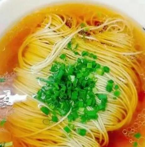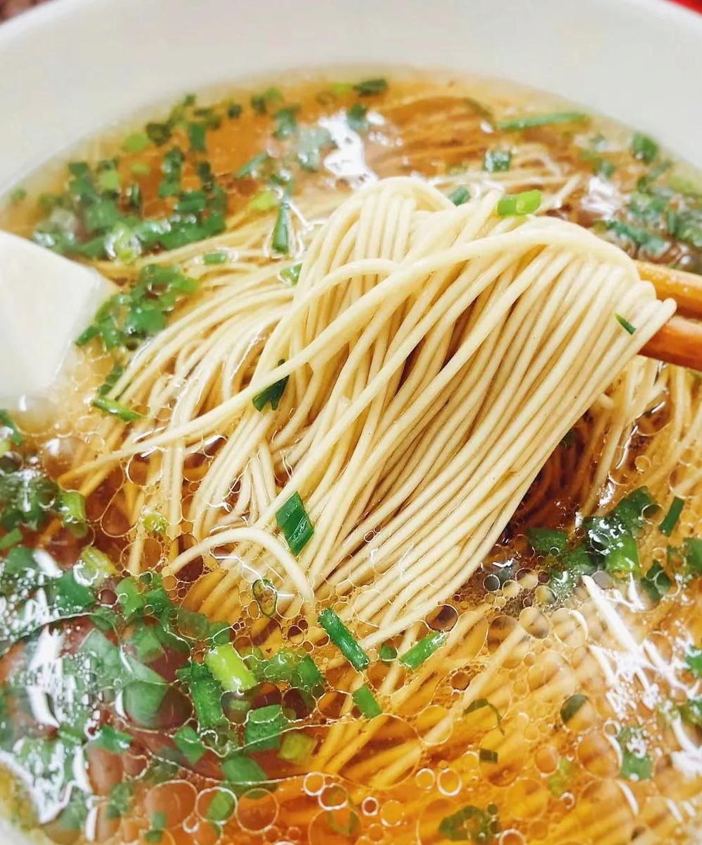 阳春面,面体劲道有韧性,撒上葱花,喝一口清澈见底的汤汁,再吃一口根根分明的面条,舒坦极了。