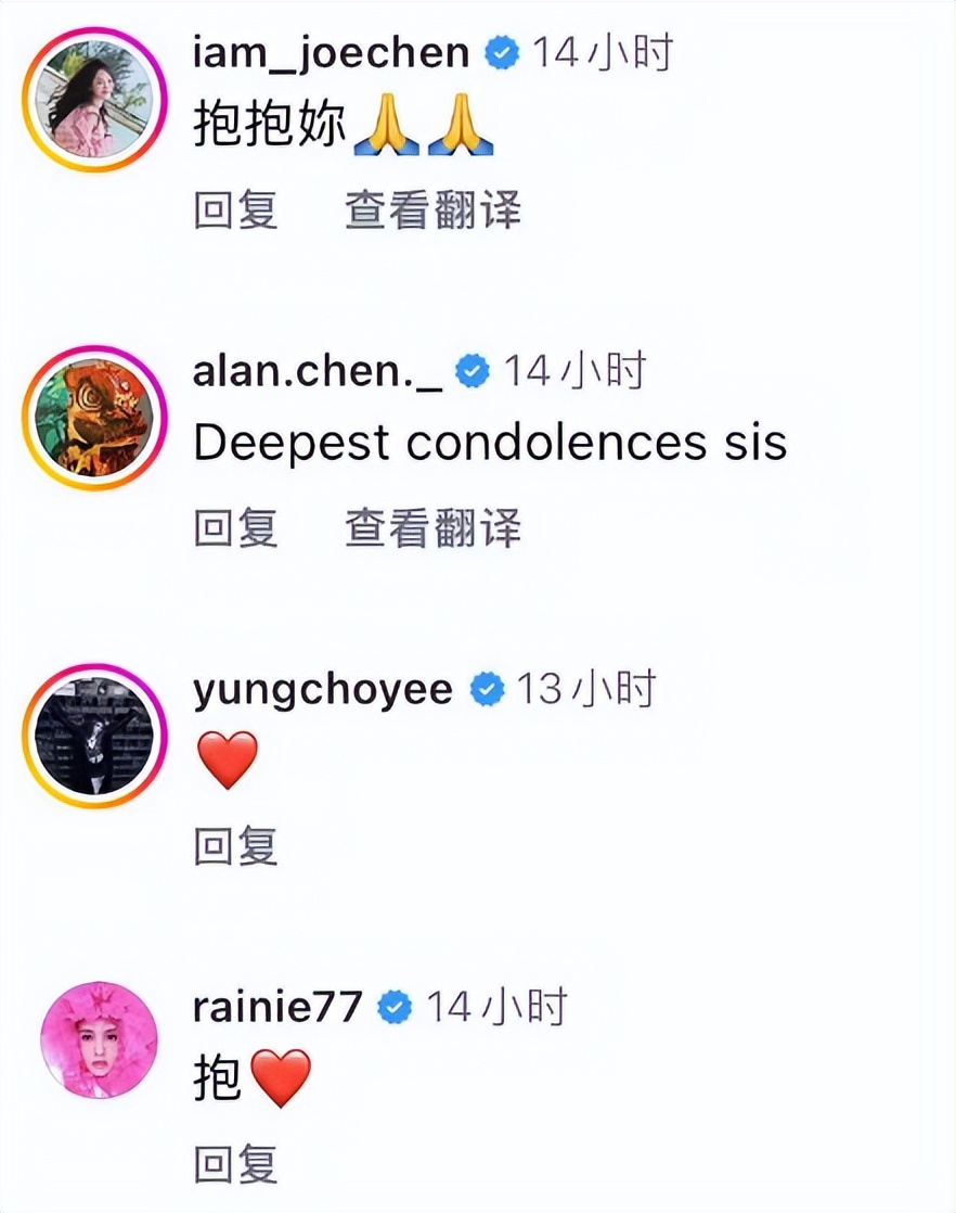 陈妍希公开爸爸去世的消息后,圈内好友陈乔恩、杨丞琳纷纷拥抱给予安慰,陈乔恩老公也在下面留言:“最深切的哀悼”。