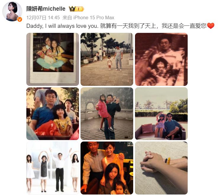 陈妍希悲痛发文:“爸爸,我会永远爱你,就算有一天我到了天上,我还是会一直爱你”,陈妍希还晒出多张全家福合影,全都是她对父亲的爱与思念,能感受到陈妍希父女的感情非常深厚,爸爸离开了,陈妍希万分不舍。