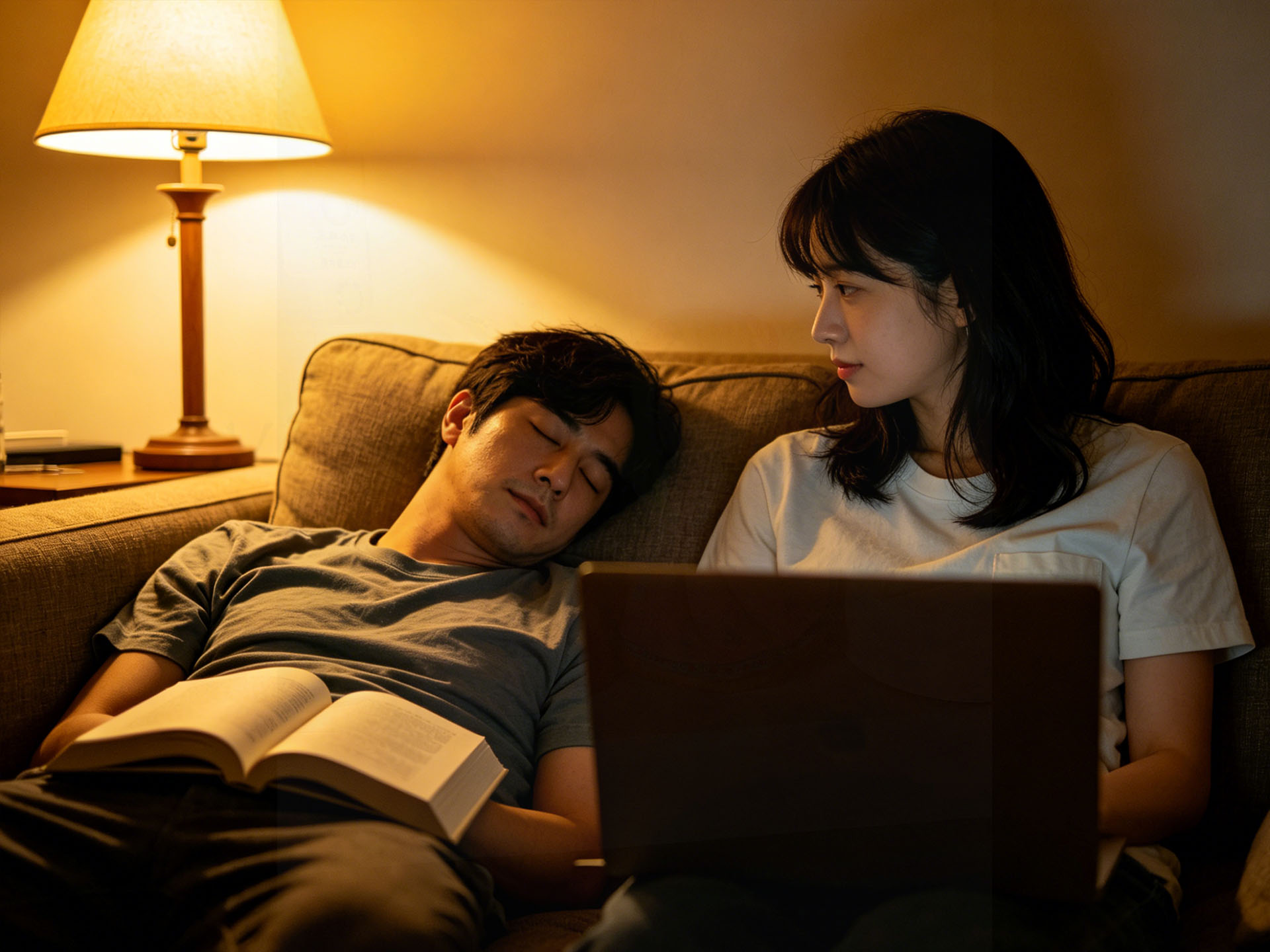 临近凌晨三点的时候,小雯最终合上了电脑 ,转而扭头看见他已然歪倒在沙发之上进入了睡眠状态 ,书本仍然摊开放置于胸口处。