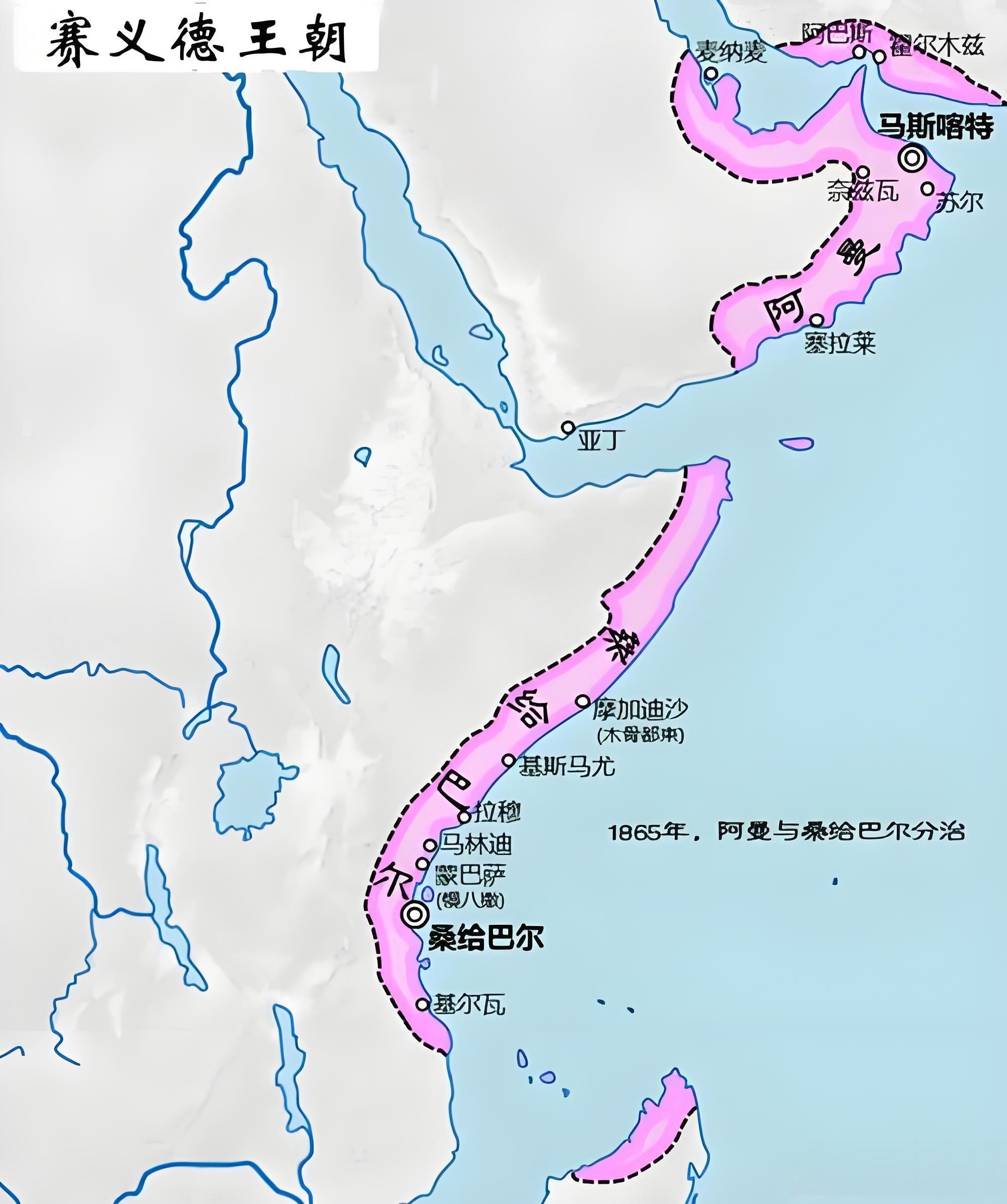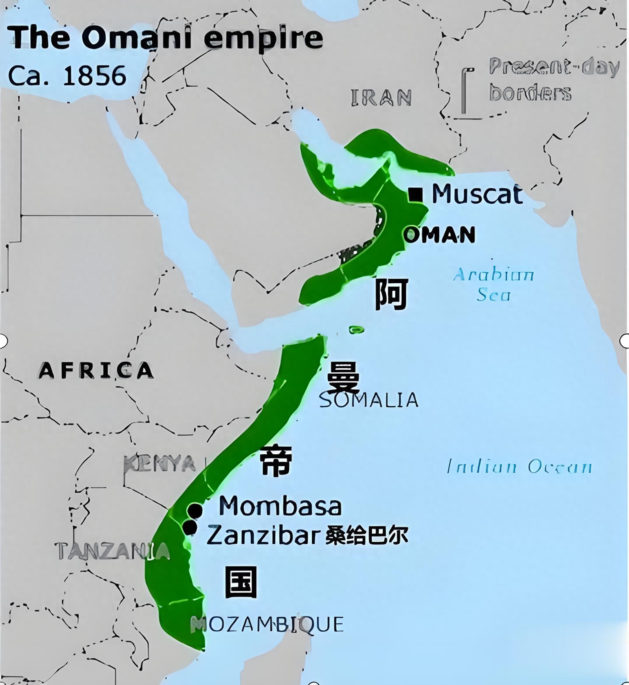 这就是史上威名赫赫的阿曼帝国(Oman Empire),历经亚里巴王朝(1642-1743)和赛义德王朝(1749-1870)。