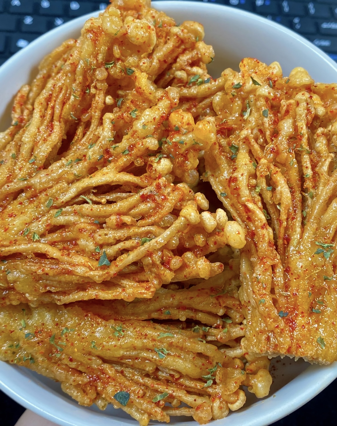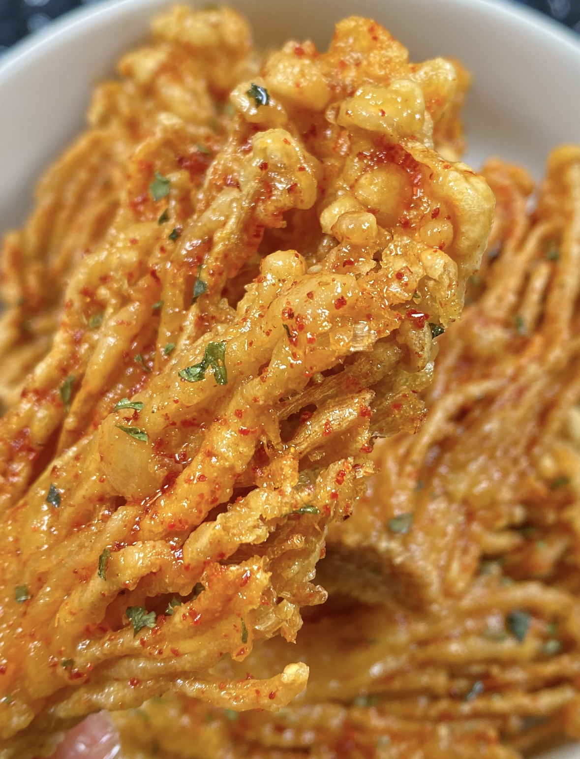 第五步:复炸是王炸!火开到最大,油温升到七成热(木筷子插进去冒密集小泡泡),金针菇二进宫,10秒就行!这次听声音:从“呲啦”变“沙沙”,颜色从奶黄到金黄,像给金针菇开了十级美颜。捞出后别急着撒料,先让它“冷静”30秒,余热会把残油吸回去,吃起来不腻歪。