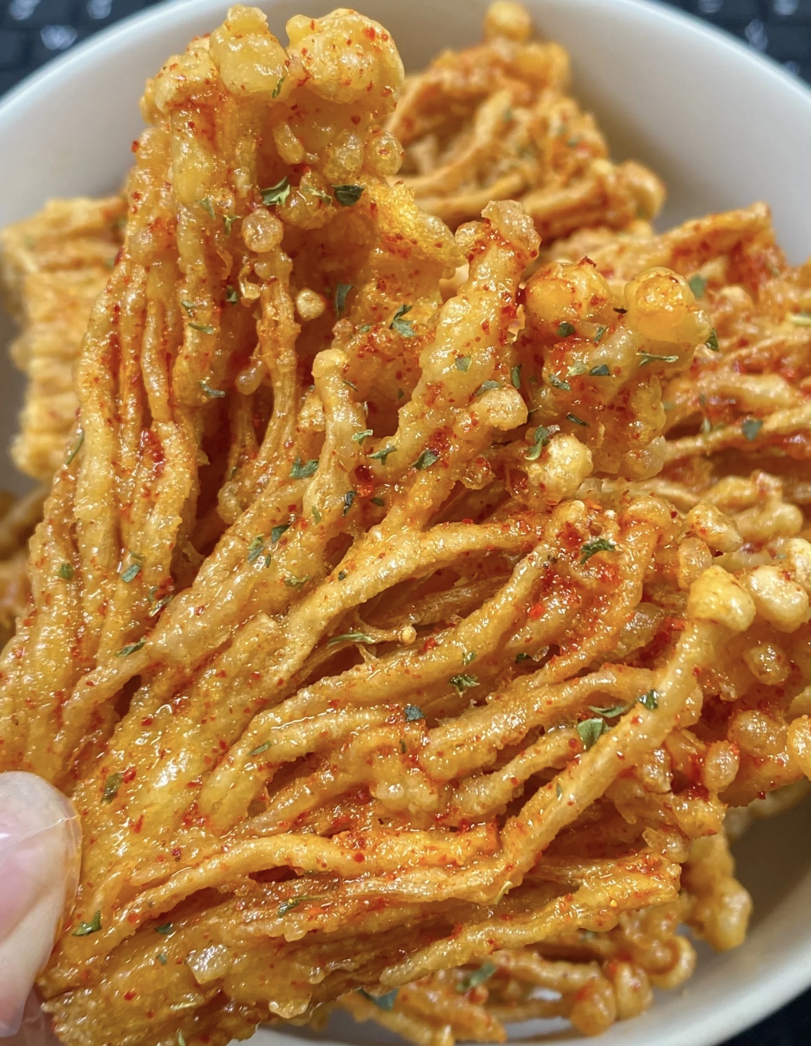 最后说个彩蛋:把炸金针菇夹在吐司里,加一片芝士,微波炉叮20秒,酥皮吸收奶香,拉丝能绕地球半圈,一口下去,什么减脂、什么卡路里,统统见鬼去!今晚就炸,记得多备两罐冰可乐,因为——一旦开吃,根本停不下来!