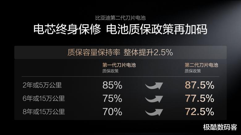 第二代刀片电池通过打造“锂离子高速通道”和“全温域智能热管理系统”,实现了更低的产热和更高效、均匀的散热,让闪充对电池寿命几乎没有影响。基于这样的底气,比亚迪还宣布电池质保政策再加码!第二代刀片电池质保的“容量保持率”整体提升2.5%,电芯依旧是“终身保修”,这就是第二代刀片电池,给所有用户的安心承诺。