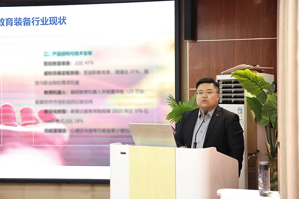 随后,总经理助理魏亚东以详实的数据与深入的分析,向与会者全面展示了利生科教的综合企业实力,并重点剖析了2026年教育装备行业将面临的核心挑战与潜在机遇。他深刻指出,单打独斗已难以适应快速变化的市场环境,唯有将洞见到的商机进行真诚分享,构建紧密的生态合作网络,方能在行业“寒冬”中积蓄能量,实现“共筑未来”的愿景。