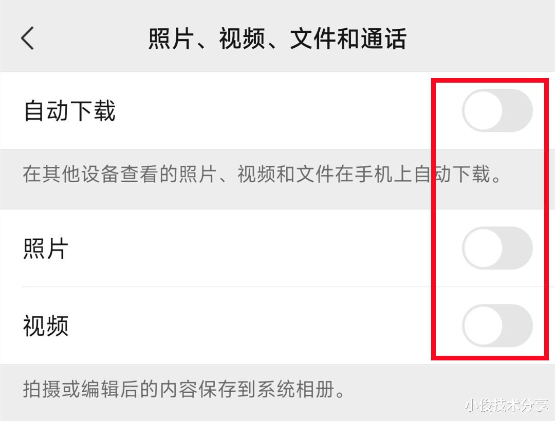 打开微信-点击右下角【我】-点击【设置】-点击【通用】-点击【照片视频文件和通话】-点击【自动下载】【照片】【视频】开关,关掉!