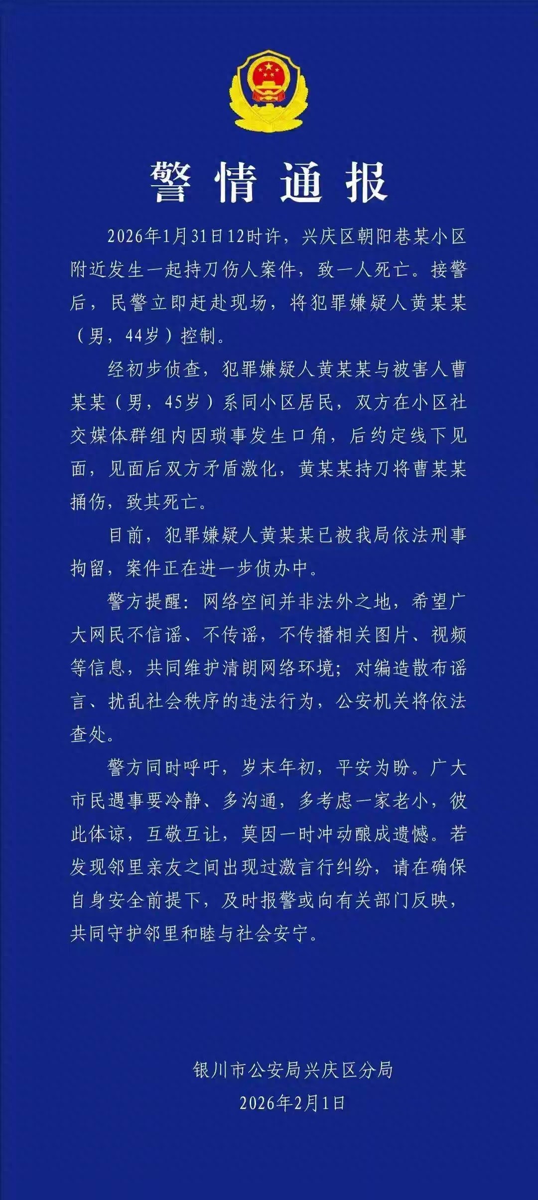 2026年2月3日,宁夏银川警方的一则通报震惊了公众。44岁的黄某某与45岁的曹某某,在小区社交媒体群组内发生口角,随后情绪失控,竟约定线下“解决”。