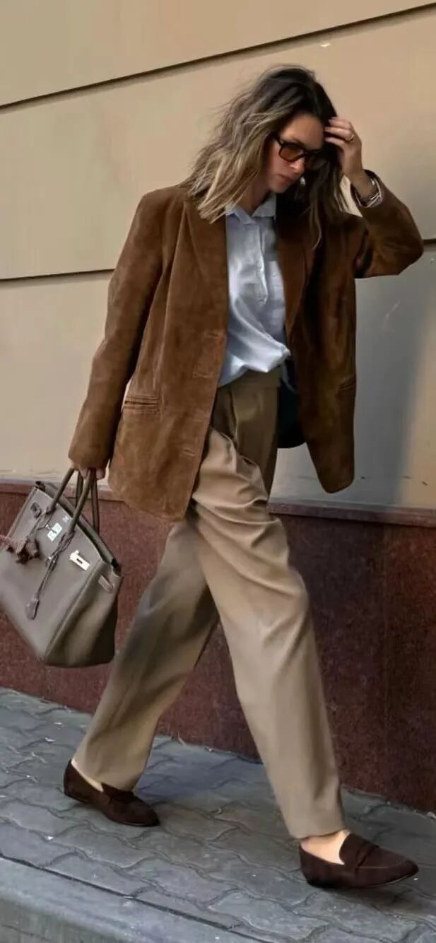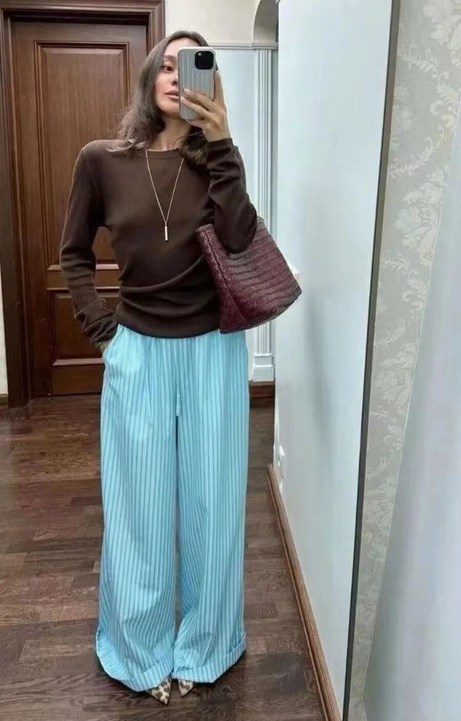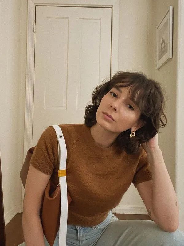比如上半身是焦糖色薄针织开衫(深秋感),