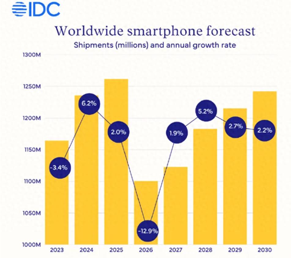 IDC认为2026年手机销量将下滑12.9%,堪称是暴跌。