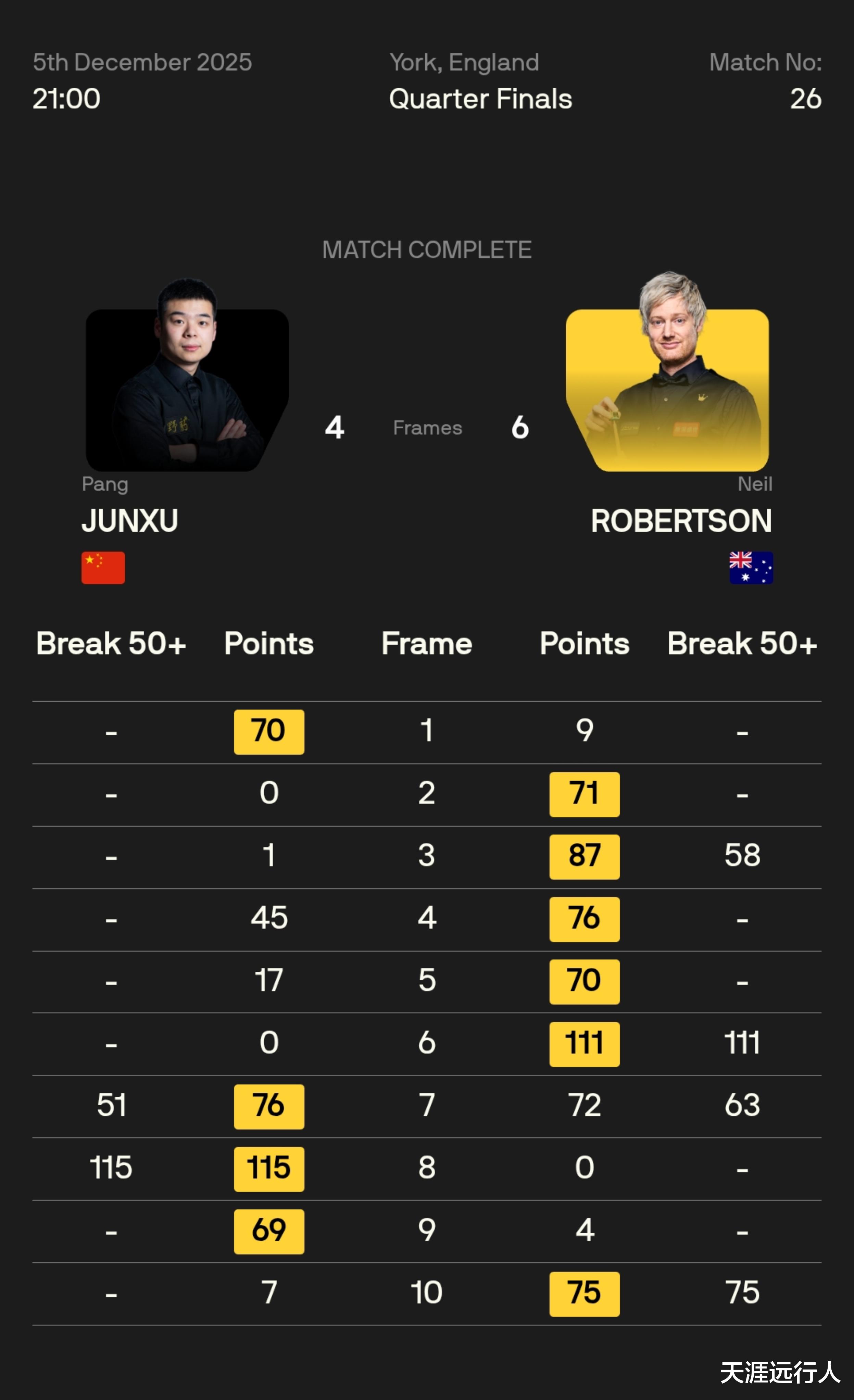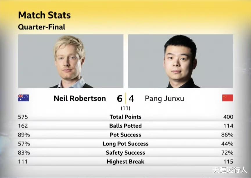 第七局,庞俊旭在大比分1-5落后、且已被超11分的绝境之下,利用一杆精彩的斯诺克,获得自由球,捞回15分,进而实现单局的超级逆转,化解了血腥的六连鞭,接下来小庞打出单杆115,再胜两局,4-5迫近比分,第10局,罗伯逊抓机会上手,打出单杆75分,超16分中断了进攻,不敢放弃的小庞依然上场尝试斯诺克,希望第七局的神奇继续,很遗憾没能成功,罗伯逊晋级四强,半决赛将对阵特鲁姆普。