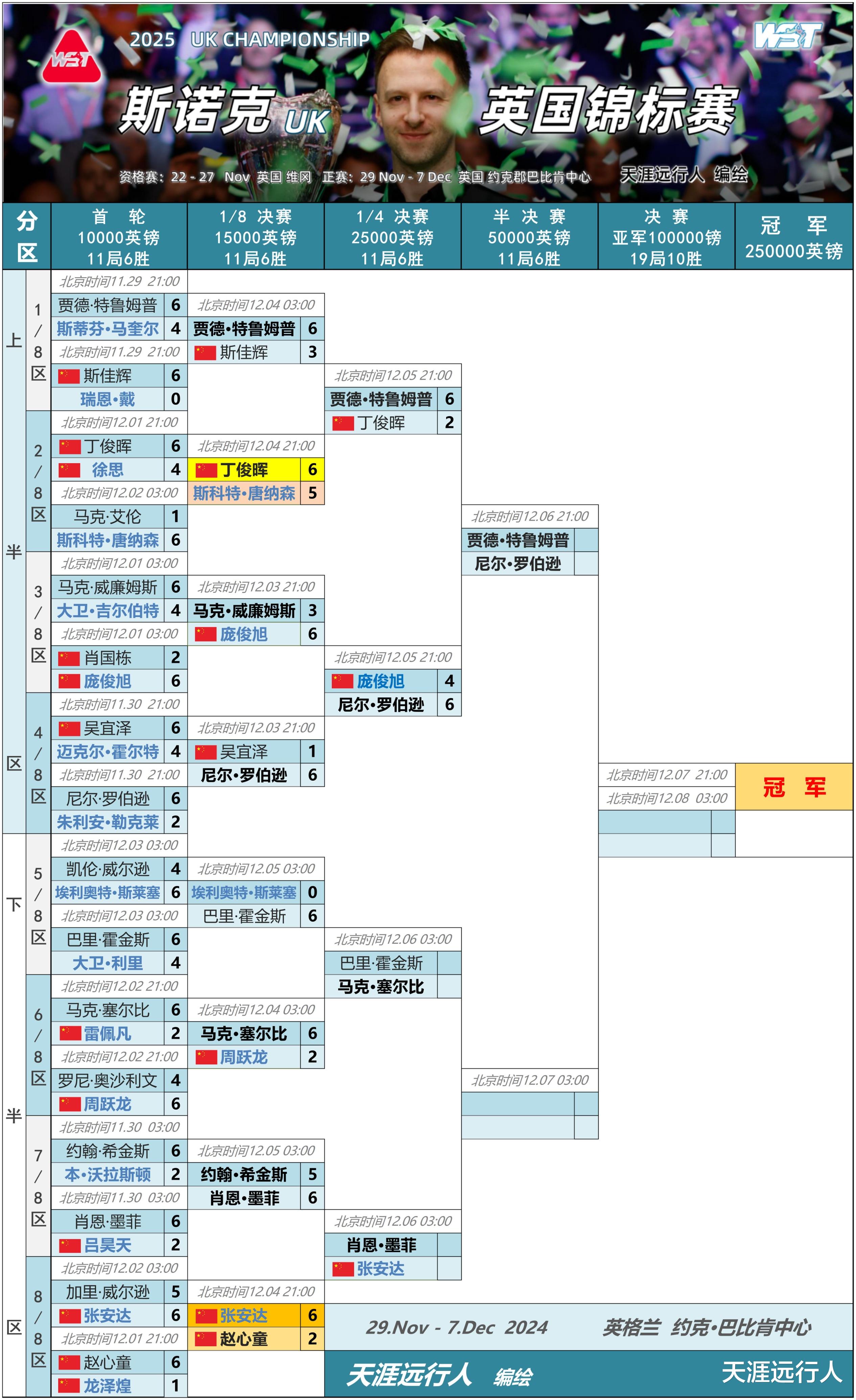 最新2025斯诺克英国锦标赛正赛进程签表,一张表格看英锦赛正赛全程的赛程战报,请转发收藏,以备不时之需;各位看官老师看看,小编做的这个签表,能称得上全网第二吗?