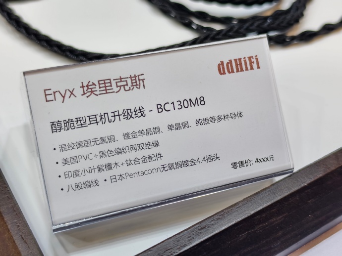 ddHiFi的这个新品升级线Eryx,售价3k+,小叶紫檀+钛合金的接插件颜值非常亮眼,具体用料如图1。不过对于dd家来说,他们的线材产品不论用什么材料,基本上都是走韵味派的路线,不过这次丁工给大家设计了两个选择,这根线基础的声音风格有着足够的醇厚度、密度,非常的扎实有力,整体的中频染色没有类似于Nyx系列那么浓郁,对人声是属于改善质感和细腻度但不会有太强的HuFi感,而对于更重度的人声用户来说,有镀佬版本的插头可选,声音有着更宽松、更丰富的人声细节,低频也会显得更加有弥散感一点,这个插头的价格会稍贵,听感变化要大于素质变化,大家可以根据自己的需求选择。