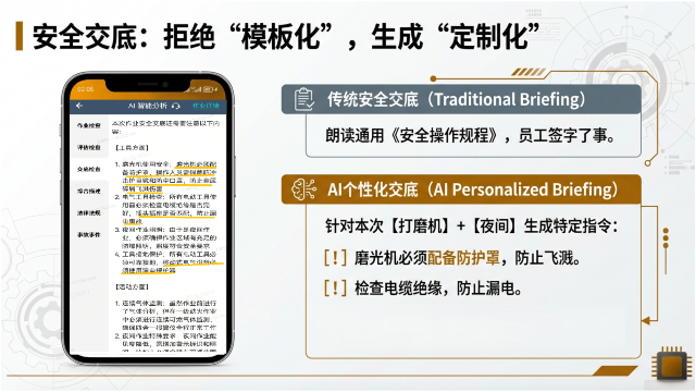 安全交底环节打破传统 "模板化" 模式,基于作业具体场景生成 "定制化" 指令。针对夜间动火打磨作业,系统从工具使用、电气安全、照明保障、气体监测等维度制定专属交底内容,明确磨光机防护罩配备、防爆照明要求、连续气体监测等关键事项,让安全要求直达作业核心。