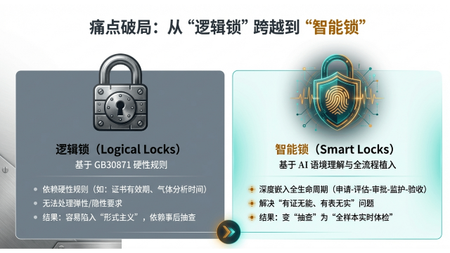 传统化工特殊作业管理依赖 GB30871 等硬性规则构建的 "逻辑锁",存在弹性需求处理不足、隐患识别不全面、形式主义突出等痛点。工智道 AI 辅助作业票系统打造的 "智能锁",通过 AI 语境理解技术,将智能分析深度嵌入申请、评估、审批、监护、验收全流程,变 "事后抽查" 为 "全样本实时体检",从根本上解决 "有证无能、有表无实" 的行业难题。