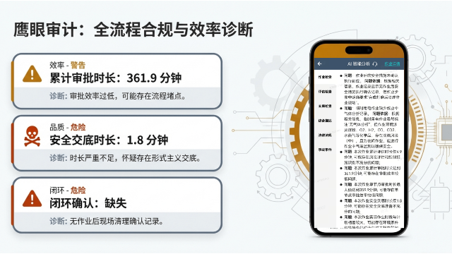 系统还具备 "鹰眼审计" 功能,对作业全流程进行效率与合规双重诊断。通过监测审批时长、交底时长、闭环确认等关键指标,及时预警流程堵点、形式主义交底等问题,推动作业管理持续优化。