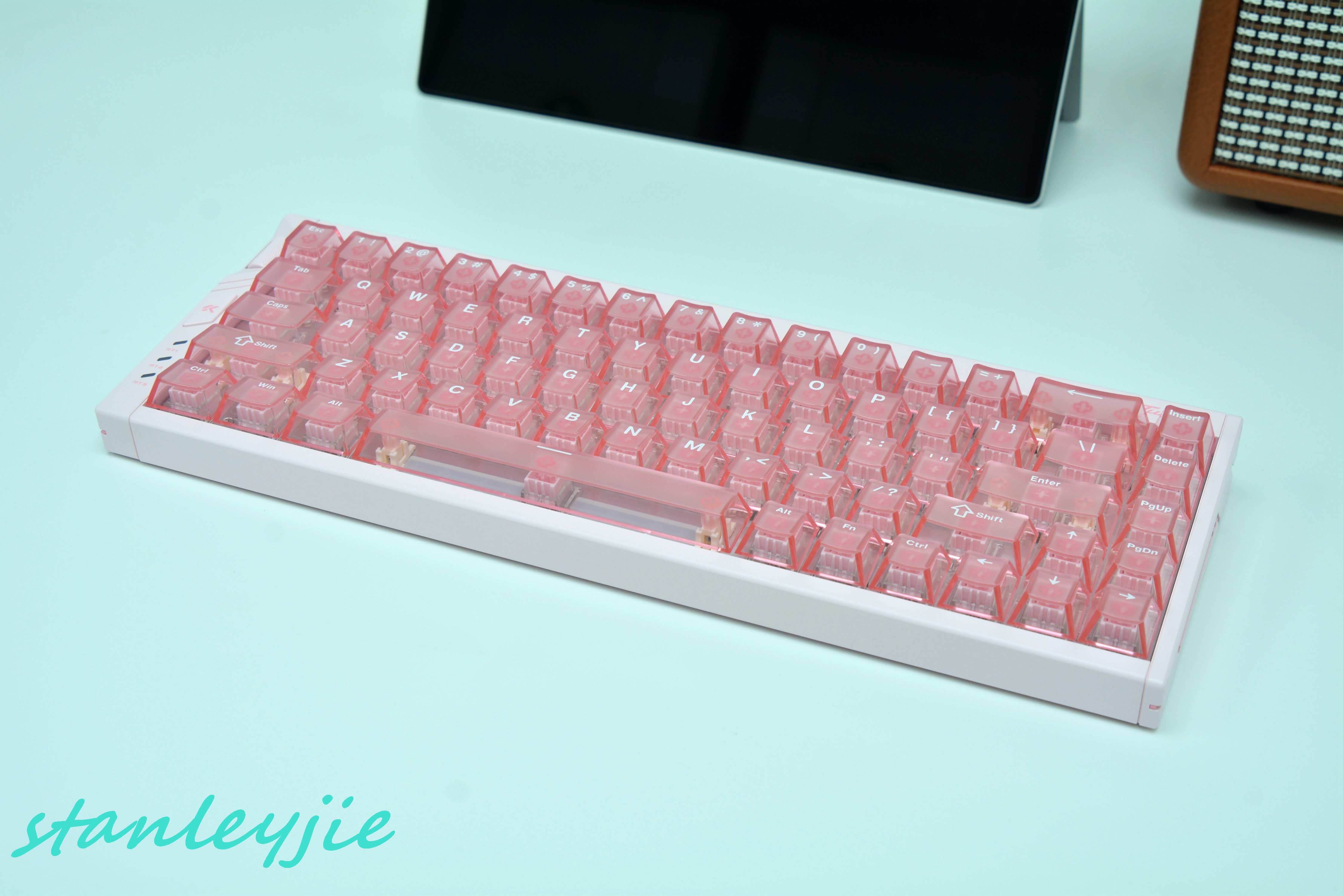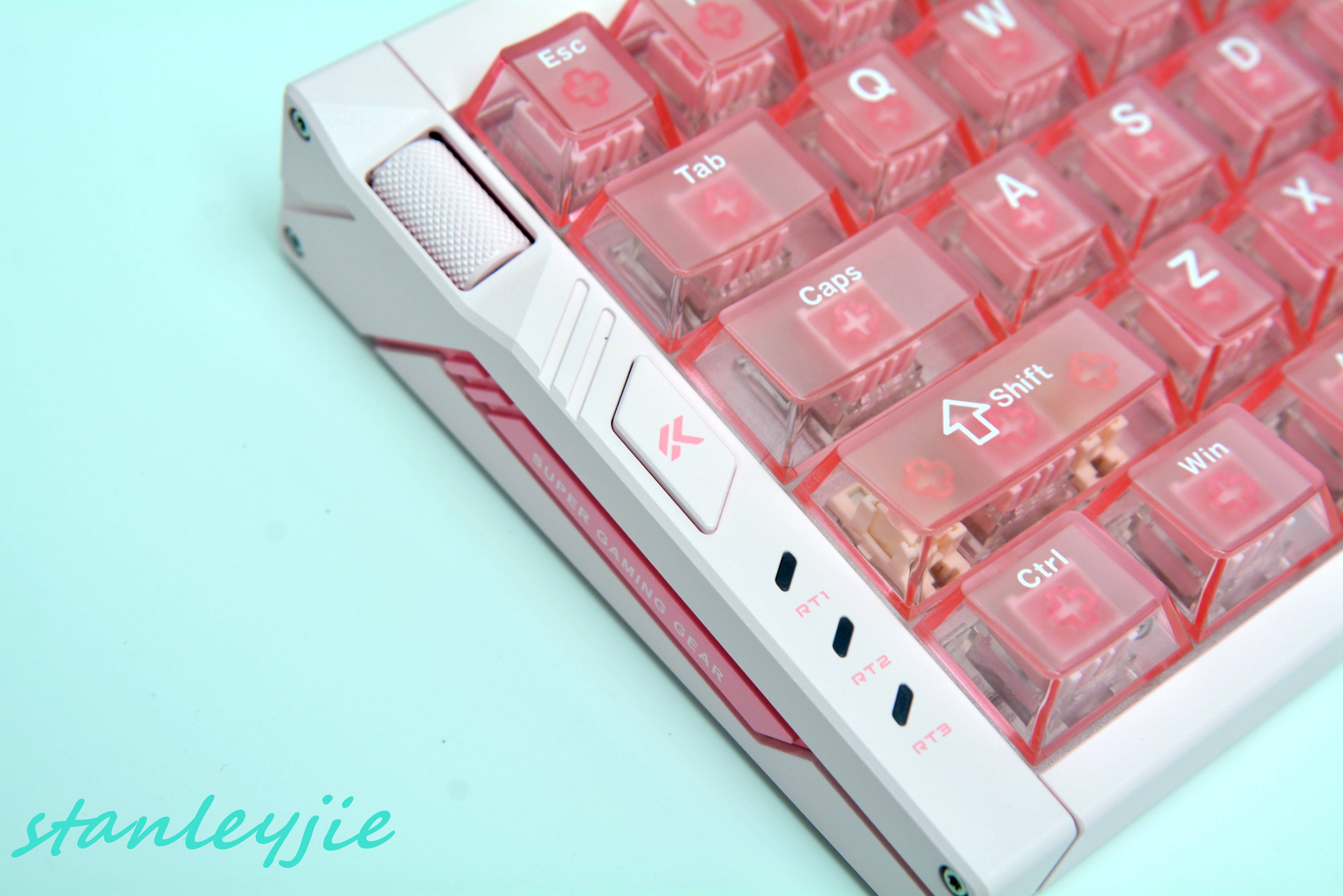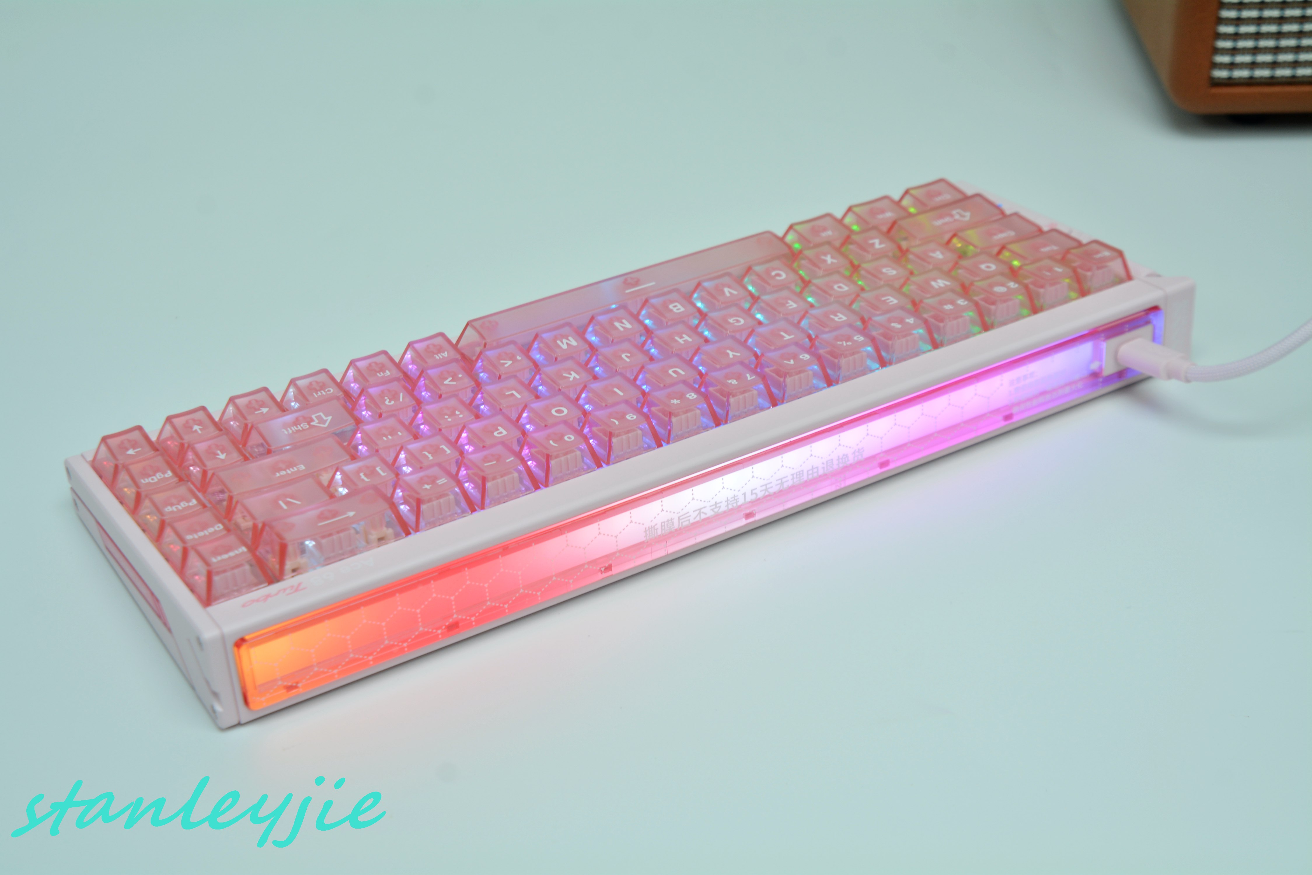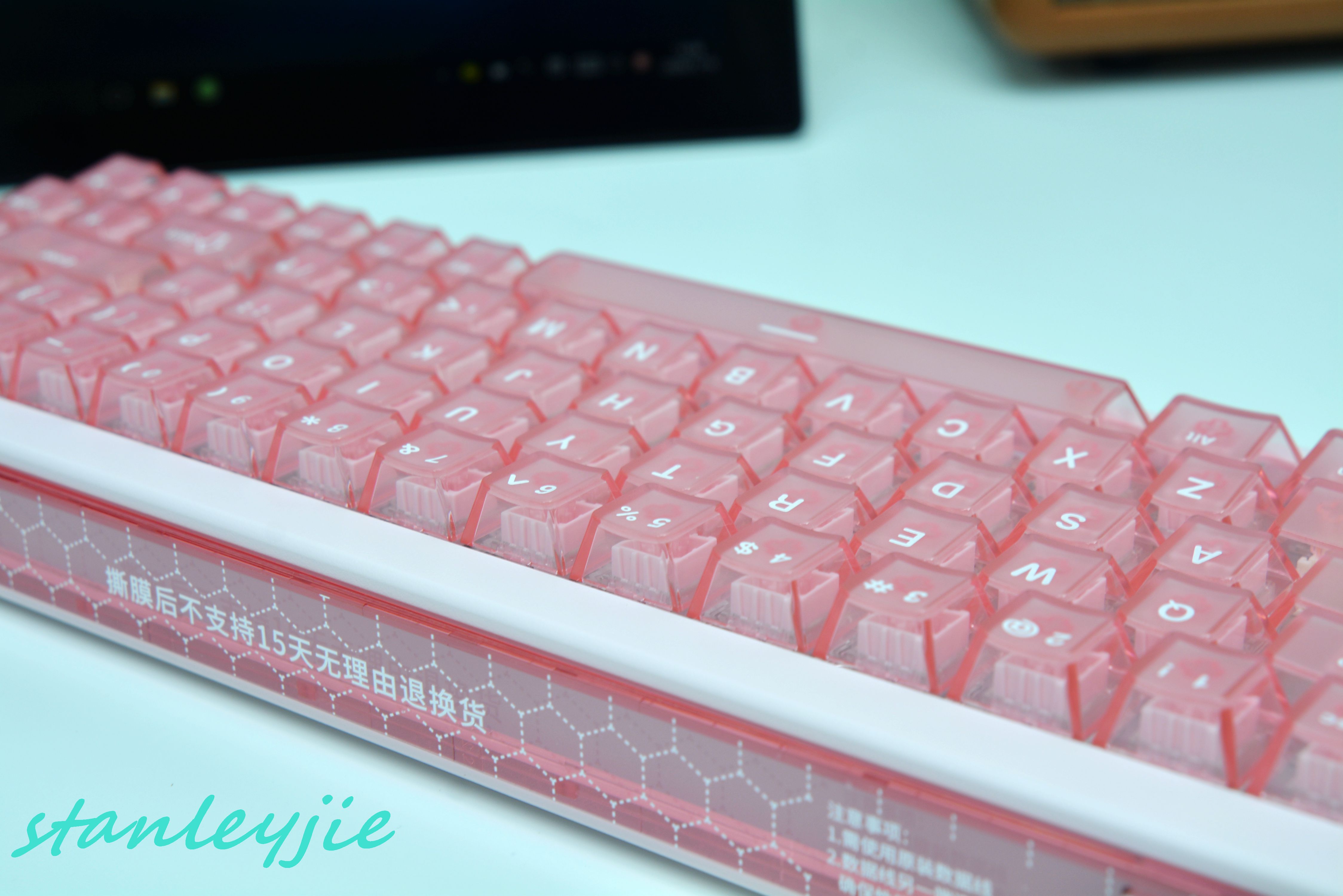 ☀键帽为 OEM 高度的粉色雾透款式,正面采用磨砂雾面工艺,印有清晰字符,既便于辨认又能提升指尖防滑性;侧边为全透明设计,为 RGB 灯光透出提供了良好条件。