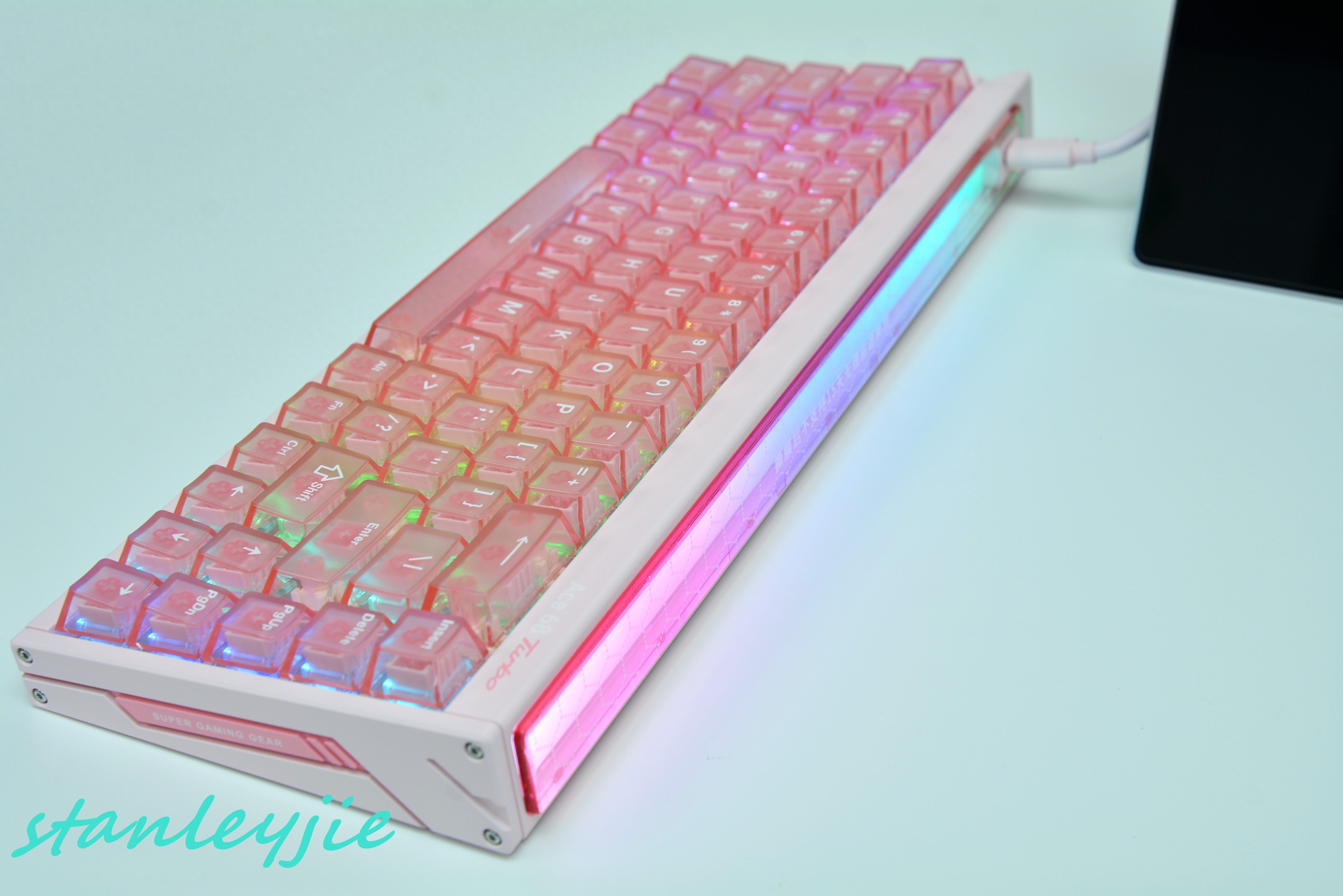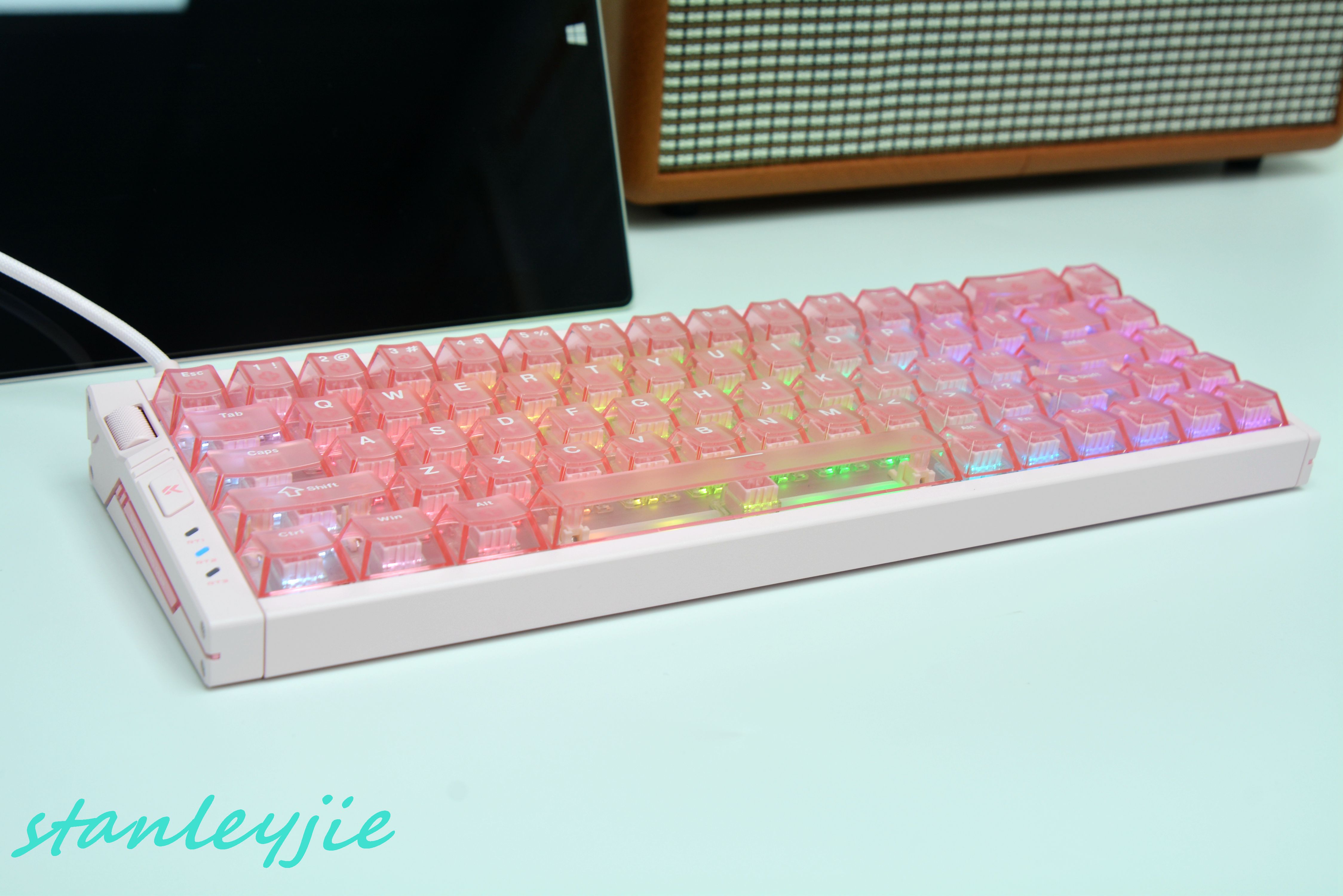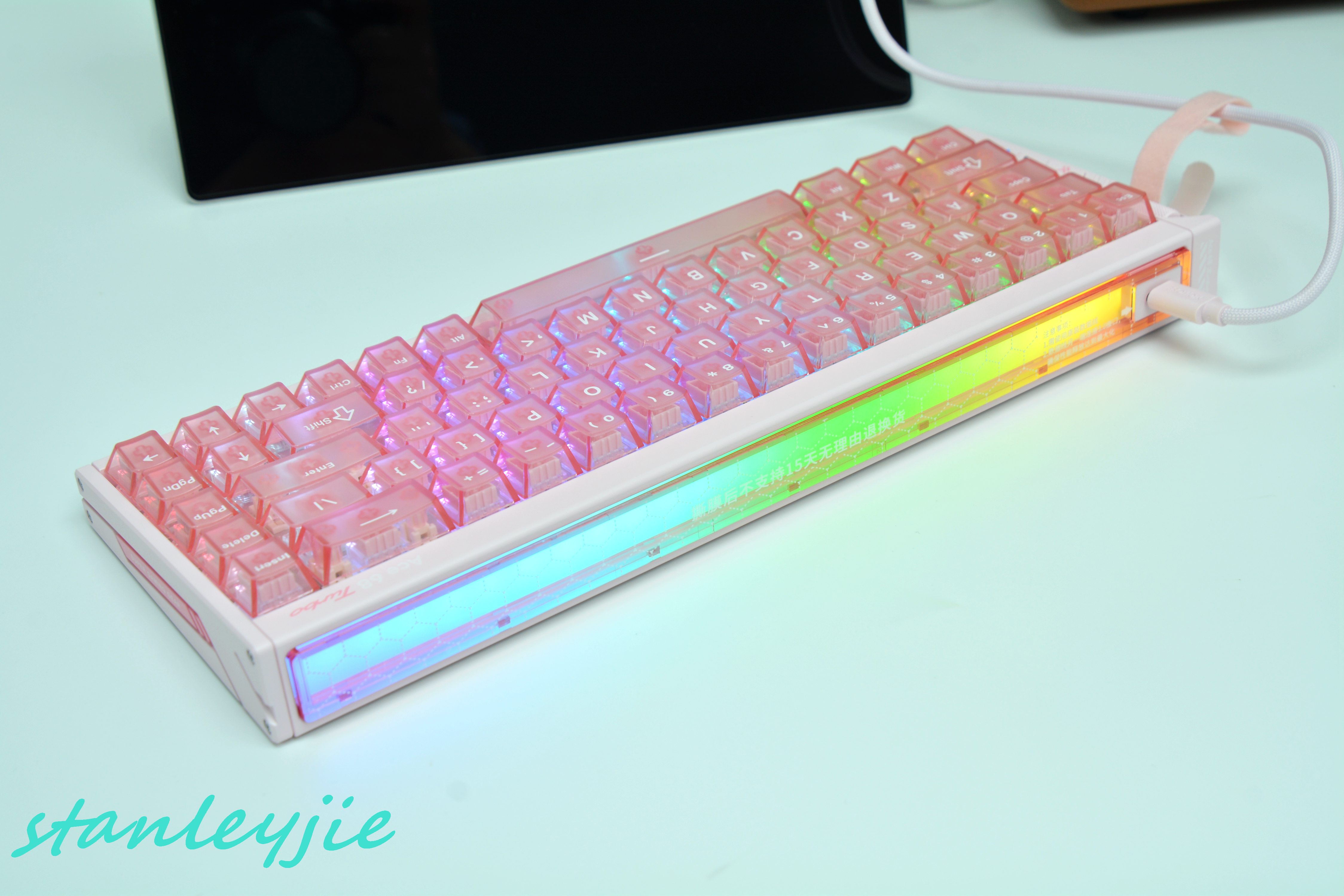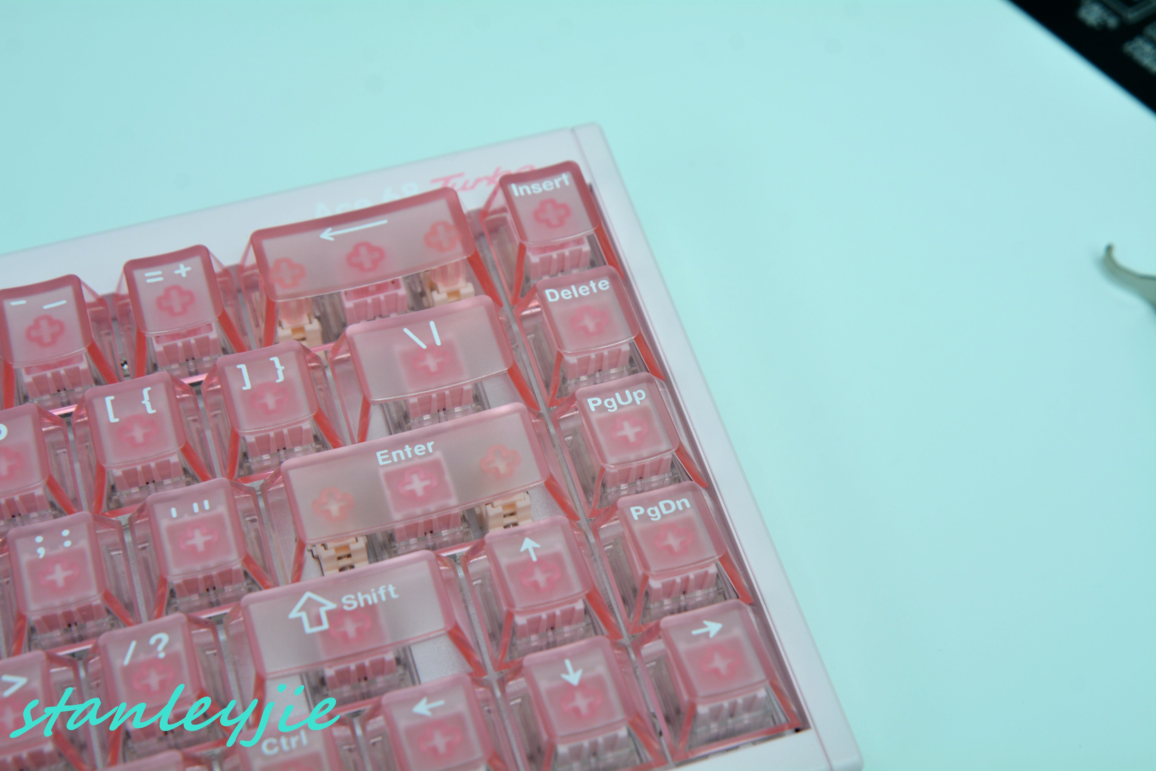 ☀键帽为 OEM 高度的粉色雾透款式,正面采用磨砂雾面工艺,印有清晰字符,既便于辨认又能提升指尖防滑性;侧边为全透明设计,为 RGB 灯光透出提供了良好条件。